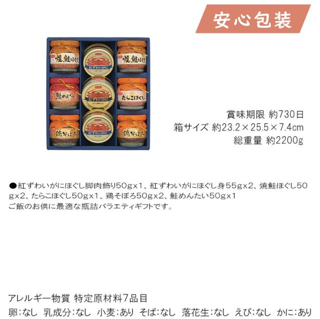 ●紅ずわいがにほぐし脚肉飾り50gx1、紅ずわいがにほぐし身55gx2、焼鮭ほぐし50gx2、たらこほぐし50gx1、鶏そぼろ50gx2、鮭めんたい50gx1