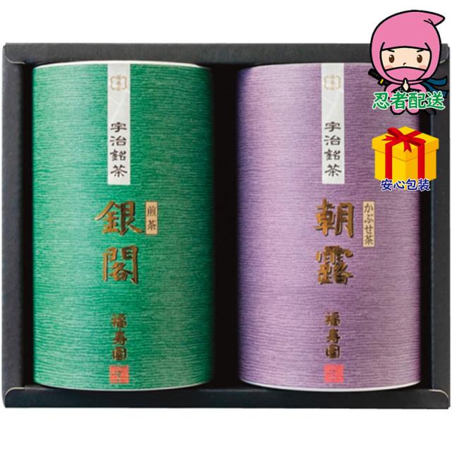 後味のよいすっきりとした旨味のかぶせ茶「朝露」と、程よく旨味と渋味が調和した清涼感のある煎茶「銀閣」。福寿園で根強い人気を誇る、2種類のお茶を詰め合わせたギフトセットです。