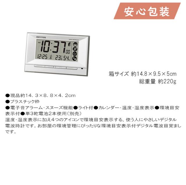 温度・湿度表示に加え4つのアイコンで環境目安表示する、使う人にやさしいデジタル電波時計です。お部屋の環境管理にぴったりな環境目安表示付デジタル電波目覚ましです。