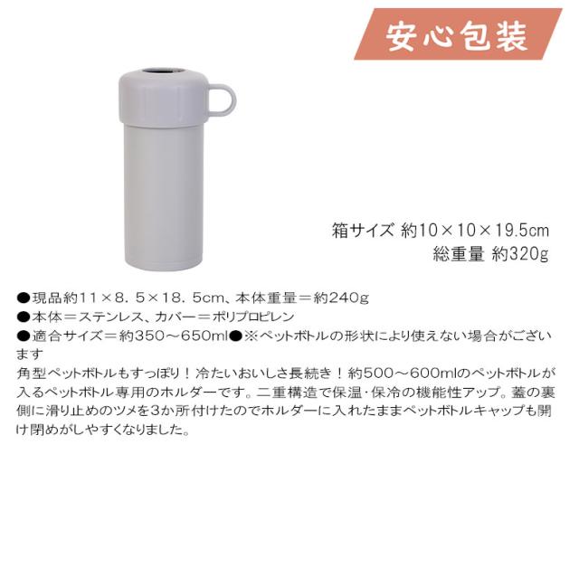 角型ペットボトルもすっぽり!冷たいおいしさ長続き!約500〜600mlのペットボトルが入るペットボトル専用のホルダーです。二重構造で保温・保冷の機能性アップ。蓋の裏側に滑り止めのツメを3か所付けたのでホルダーに入れたままペットボトルキャップも開け閉めがしやすくなりました。