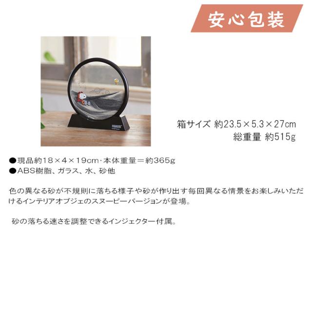 色の異なる砂が不規則に落ちる様子や砂が作り出す毎回異なる情景をお楽しみいただけるインテリアオブジェのスヌーピーバージョンが登場。