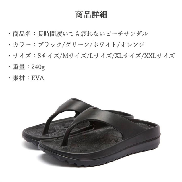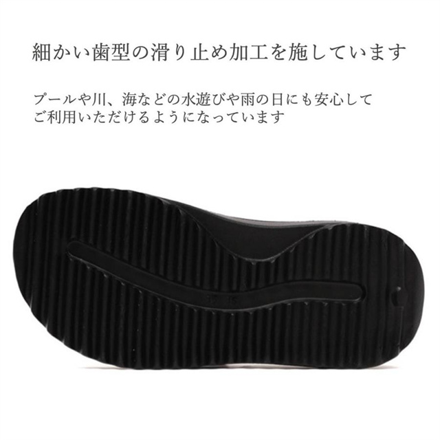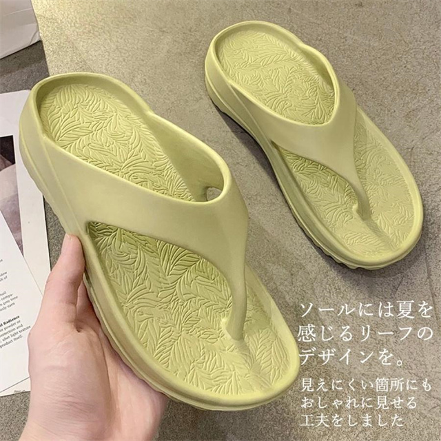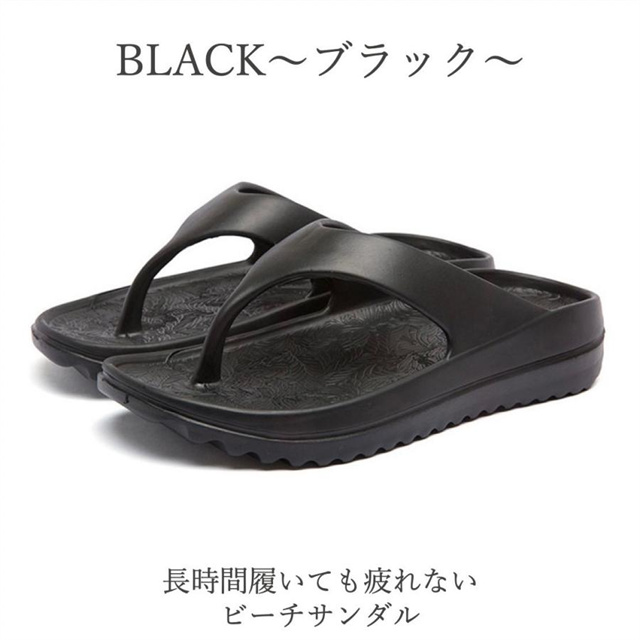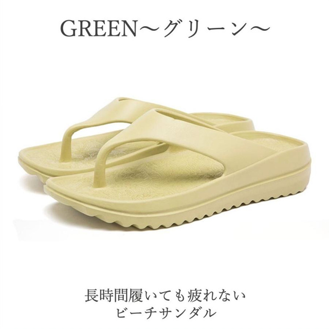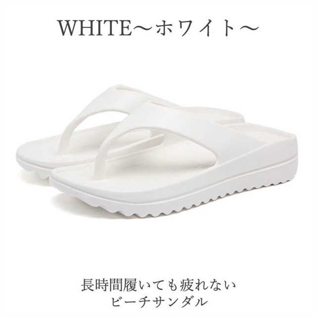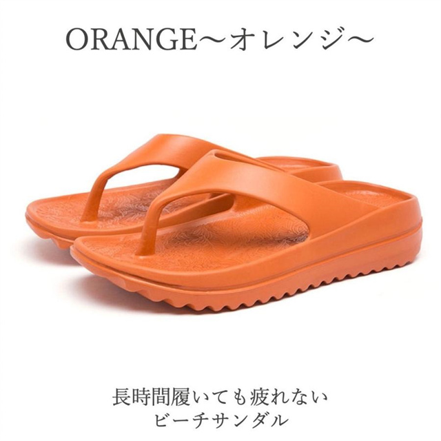 ・特徴:厚底で疲れない!おしゃれで痛くないビーチサンダル。厚底設計で長時間の使用でも疲れないビーチサンダルです。鼻緒が一体型になっているので痛くなりにくく、疲れにくい厚底のソールからリカバリーサンダルとしても人気です。室内や屋外の普段履きや、ビーチやプールの水遊びにも使える滑り止め付きのビーチサンダルになっています。軽量仕様も人気のビーチサンダルです。