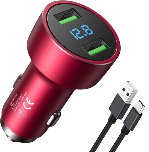 車載充電器 カーチャージャー PSE認証 4.8A 2USBポート USB TYPE-Cケーブル付き 電圧計 12V/24V車対応 スマホ急速充電 IPHONE IPAD SAMSUNG GALAXYなと対応 (レッド)