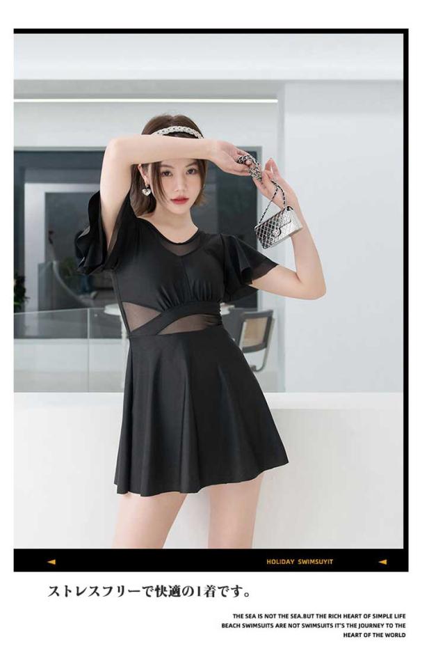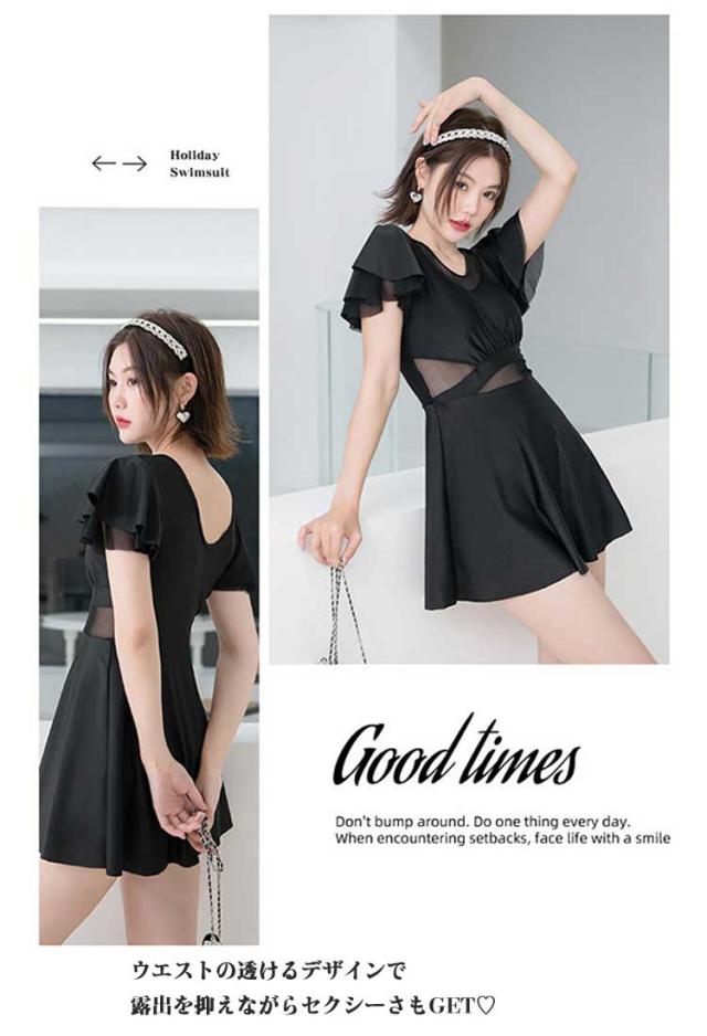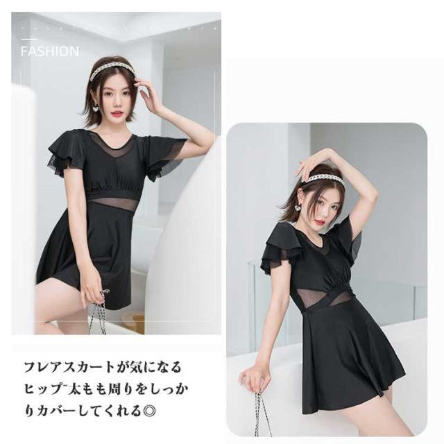透け感 レディース ミセス 体型カバー水着 50代 フリル袖 大きいサイズ 30代 20代 ママ水着 ワンピース水着 40代 オールインワン 無地 かわいい 半袖 スイムウエア おしゃれ カップ付き インナーパンツ付き フレアスカート
