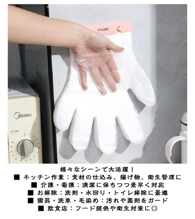 | 200枚入り しっかり丈夫な使い捨て手袋! 専用ホルダー付き 片手で1秒装着! 忙しいキッチンや掃除中でも、片手でパッと装着可能! 専用ホルダー付きで1枚ずつ取り出せて、清潔&衛生的♪ 厚手素材で破れにくく、耐水・耐油設計。無臭のABS素材で安心。 設置は簡単!粘着テープ付きで冷蔵庫・棚・壁などに自由設置OK! 様々なシーンで大活躍! ■ キッチン作業:食材の仕込み、揚げ物、衛生管理に ■ 介護・看護:清潔に保ちつつ素早く対応 ■ お掃除:洗剤・水回り・トイレ掃除に最適 ■ 園芸・洗車・毛染め:汚れや薬剤をガード ■ 飲食店:フード提供や衛生対策に◎ | |