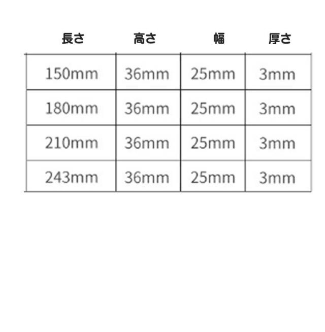 | サイズについての説明 | 150mm:長さ150mm/高さ36mm/幅25mm/厚さ3mm 180mm:長さ180mm/高さ36mm/幅25mm/厚さ3mm 210mm:長さ210mm/高さ36mm/幅25mm/厚さ3mm 243mm:長さ243mm/高さ36mm/幅25mm/厚さ3mm ※実寸はメジャー採寸の為、若干の誤差が生じる場合があります。 |