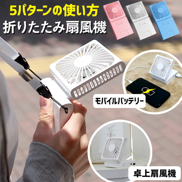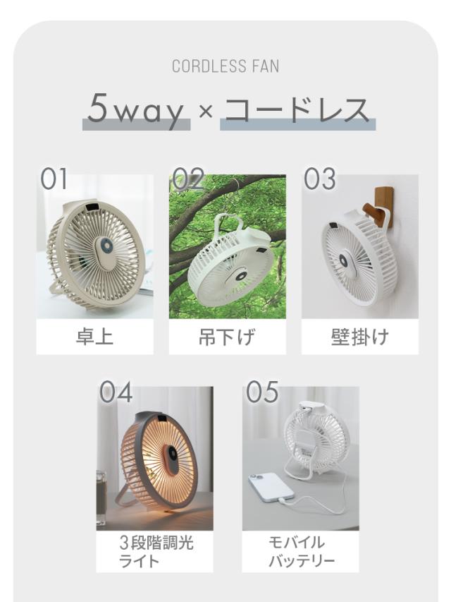 卓上、吊下げ、壁掛け、ライト、モバイルバッテリーの5wayミニ扇風機。