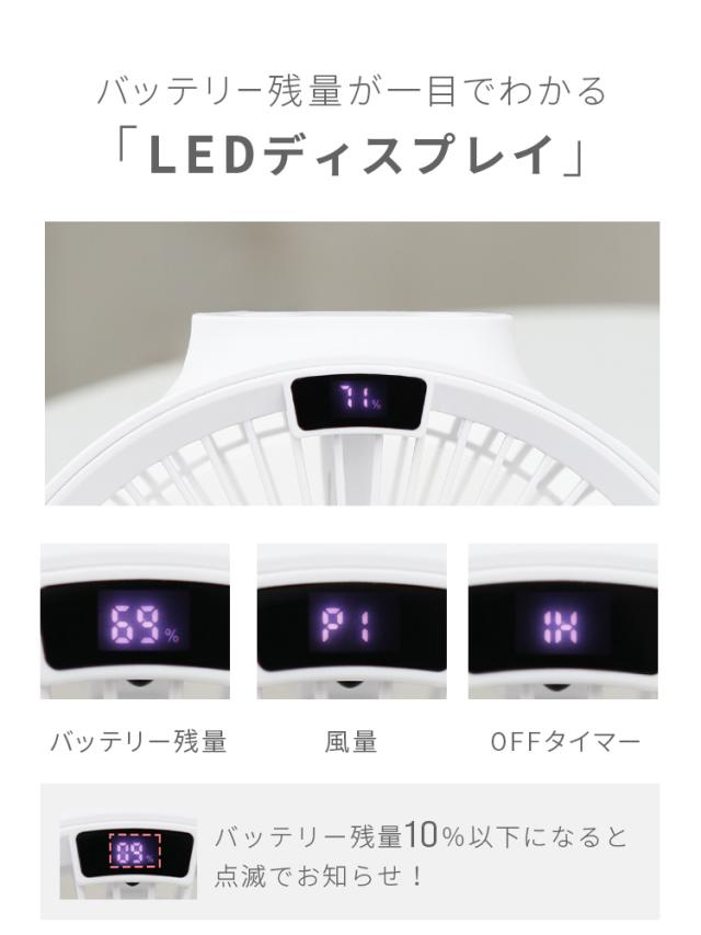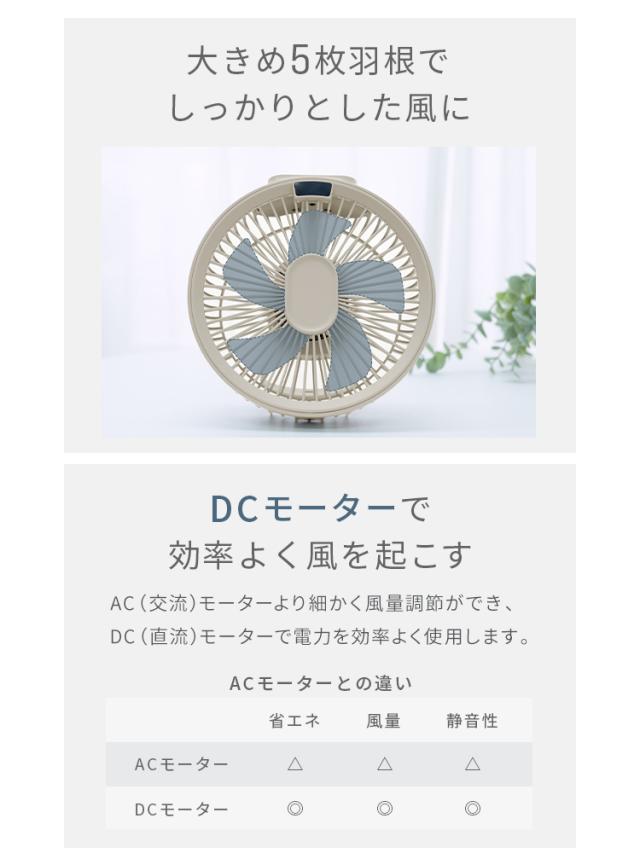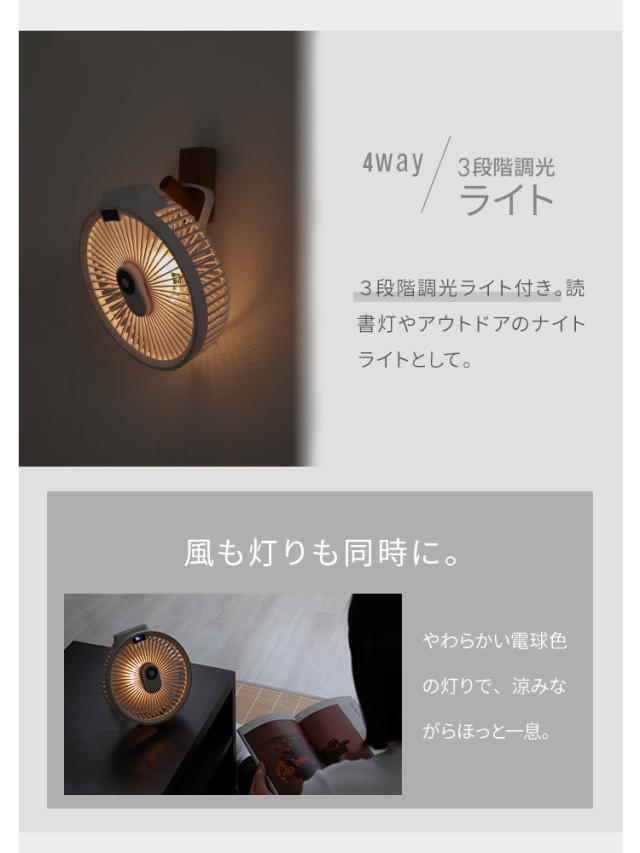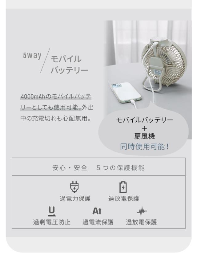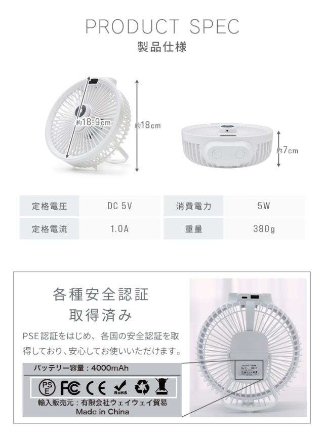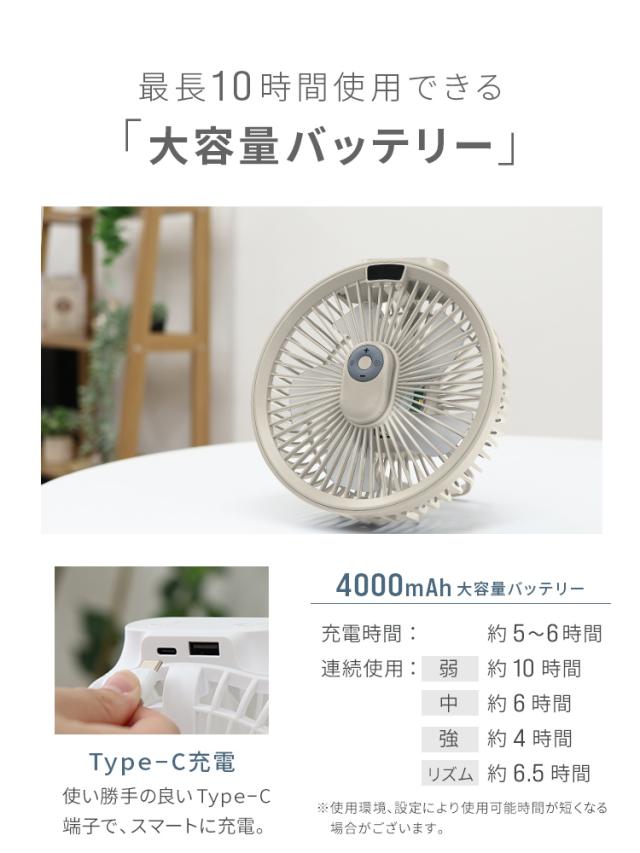 ・風量4段階 弱・中・強・リズム運転 ・3段階調光ライト ・バッテリ容量4000mAh ・USB TypeC充電(充電ケーブル付属) ・マグネット式のリモコン付属 ・タイマー1・2・3H ・スマホなどを充電できるUSB-A出力端子 ・バッテリー残量LEDディスプレイ表示 |