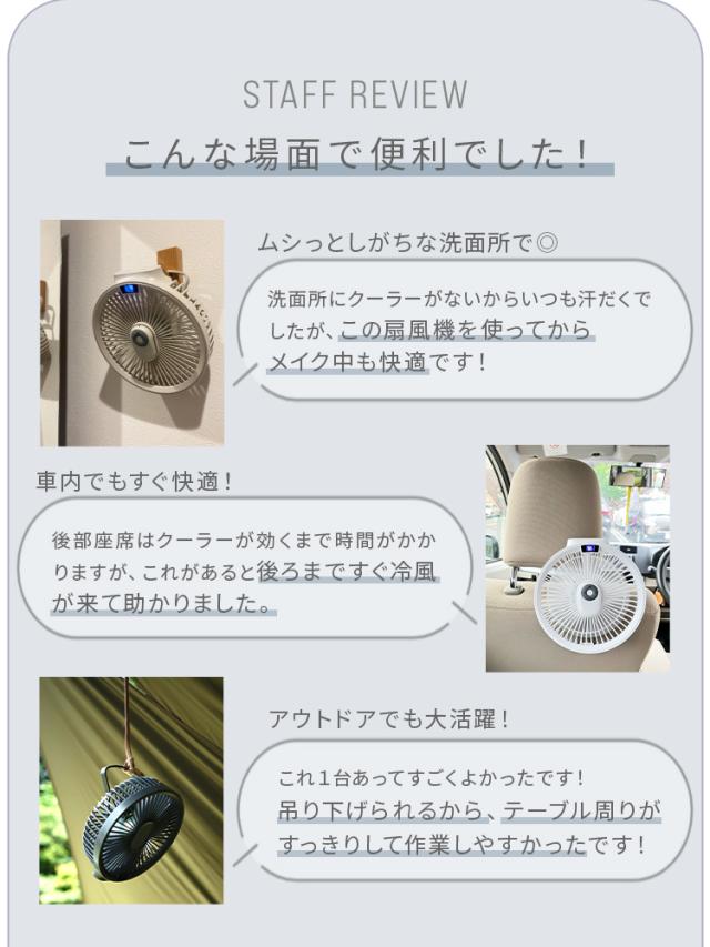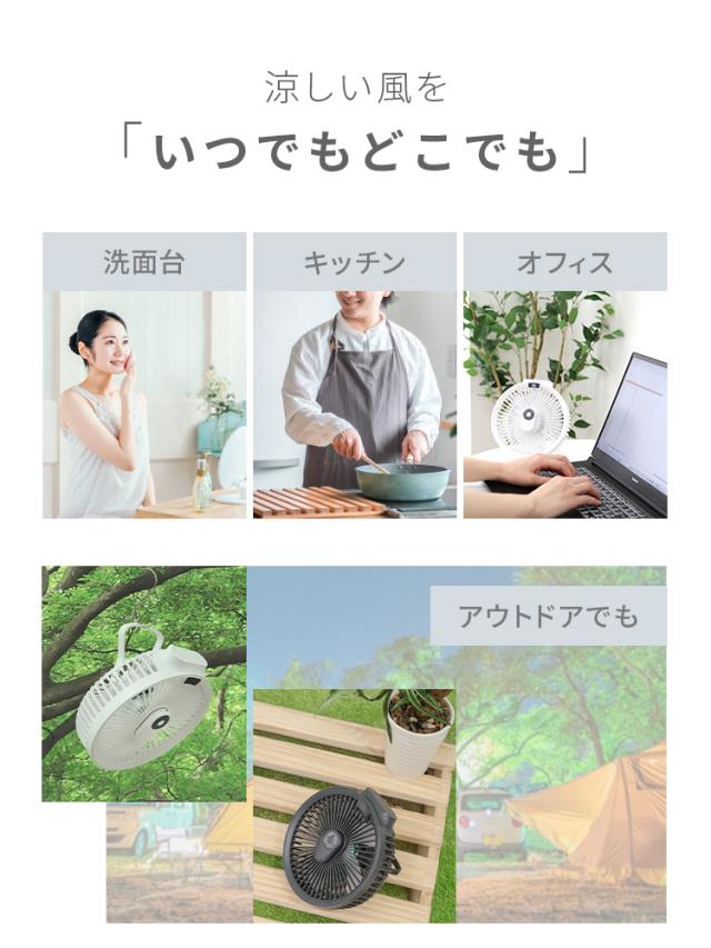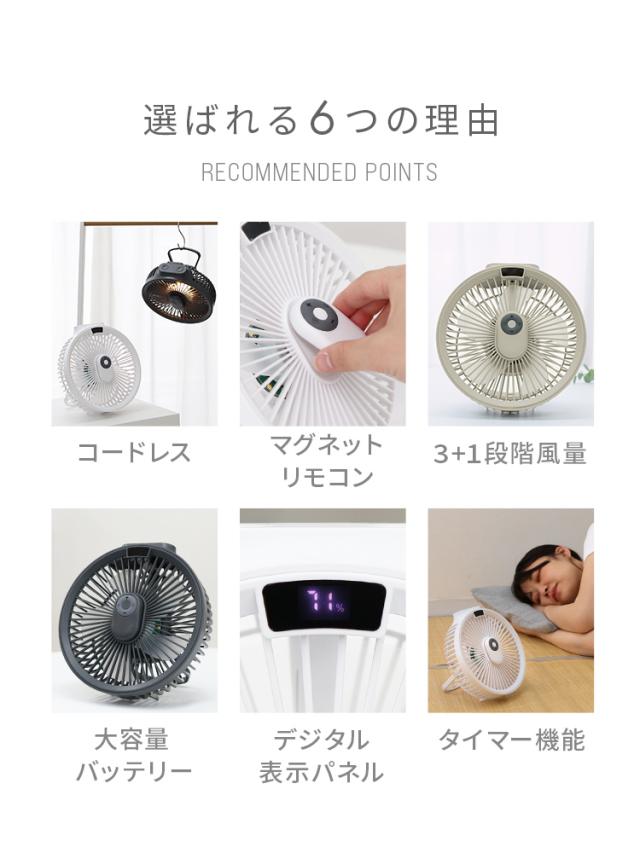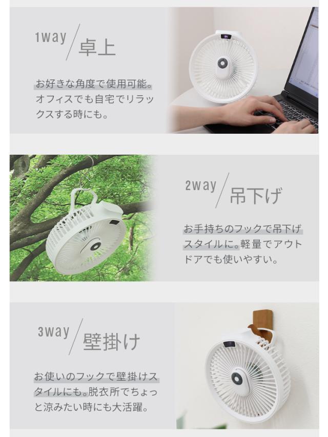 | 特徴 | ・卓上&吊り下げで使用できるコードレス扇風機