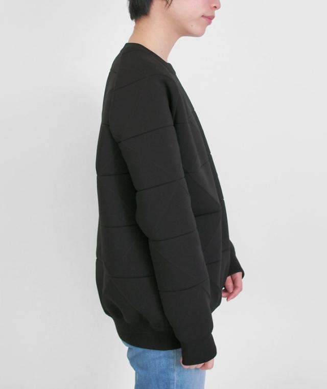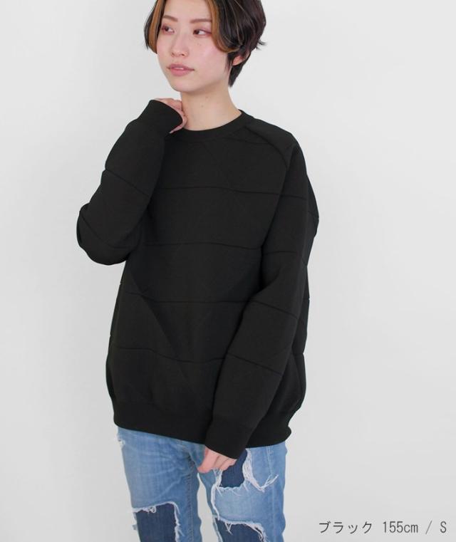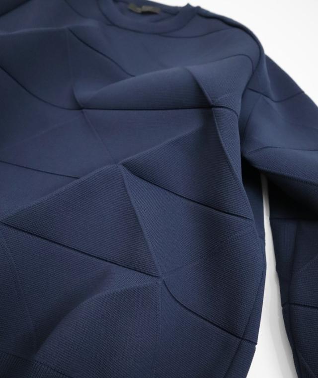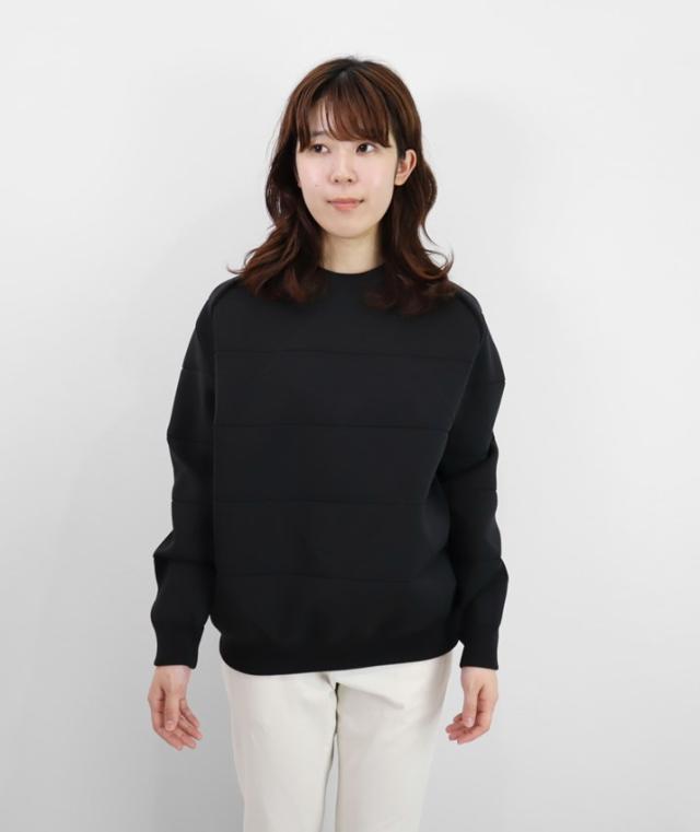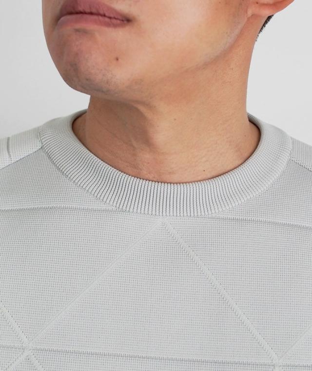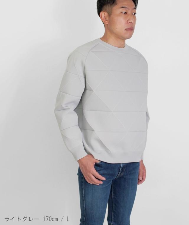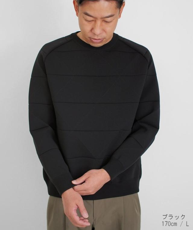 着心地が良いよう、衿ぐりから脇にかけて斜めに切り替えるラグランスリーブを採用。肩や腕が動かしやすいデザインです。カクカクした見た目ですが編地はしなやかでニットの伸縮性もあり着心地が良いです。