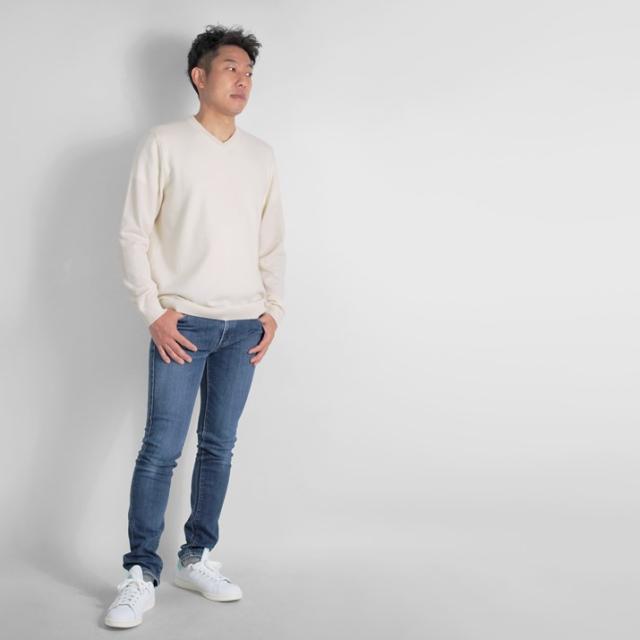 スーツのインナーやジャケットと合わせたきれい目コーデはもちろん、デニムと合わせたカジュアルスタイルにもOK。どんなコーディネートも、上質なカシミヤだから品良くまとまります。