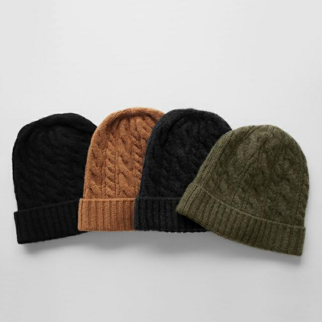 | カシミヤ100%両畦ニットキャップ | カシミヤ100%太ケーブル編みニットキャップ |
