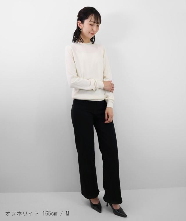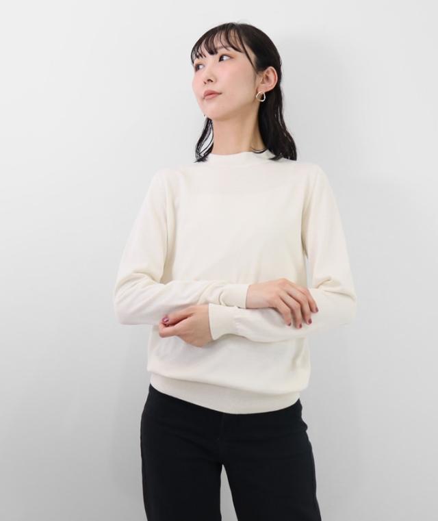 首に優しく沿うハイネックは、防寒性もありながら程よい丈感で顔回まわりがすっきり見えます。アクセサリーが映える上品なネックラインです。