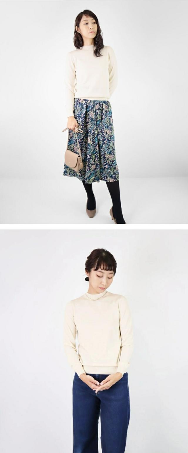 パンツにもスカートにも合わせやすいシンプルなデザインだから、着回し力も抜群です。1枚で着るのはもちろん、ワンピースやジャケットのインナーとしても重宝します。薄手なのでもたつかず、すっきりと着ていただけます。オフィスカジュアルなどのきれいめスタイルにも合うので、コーデの幅が広がります。