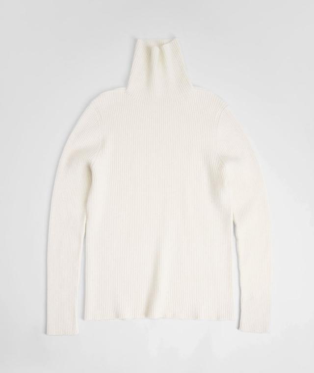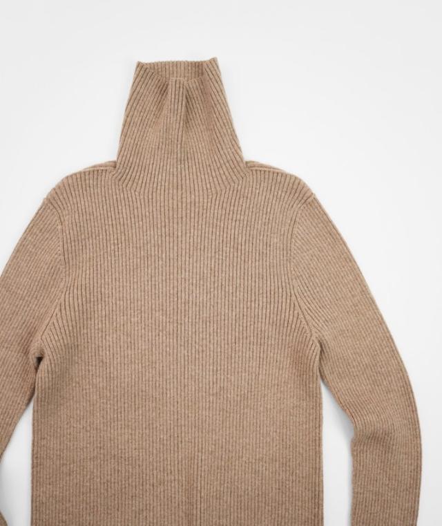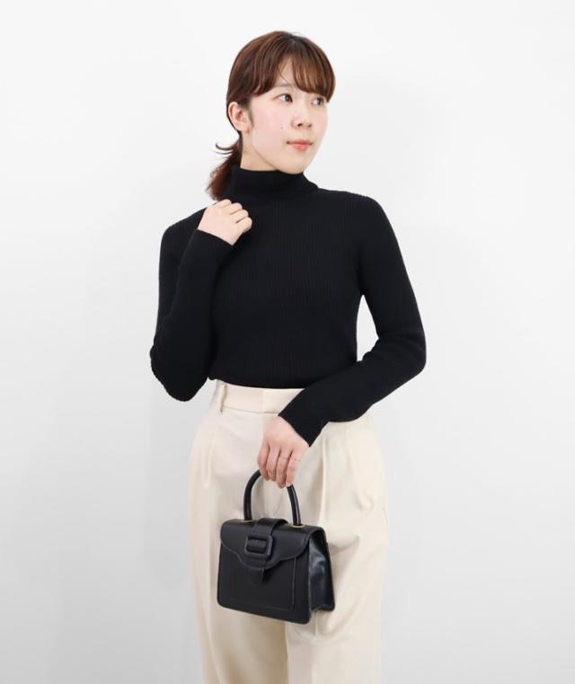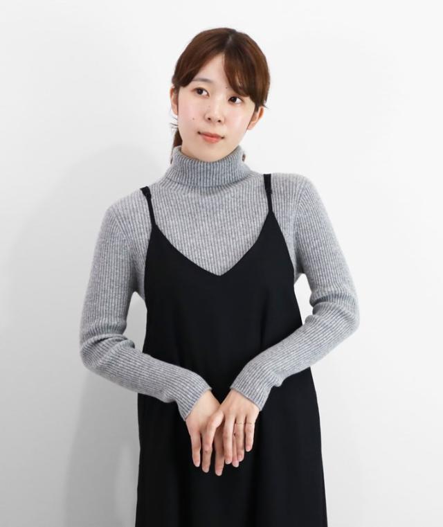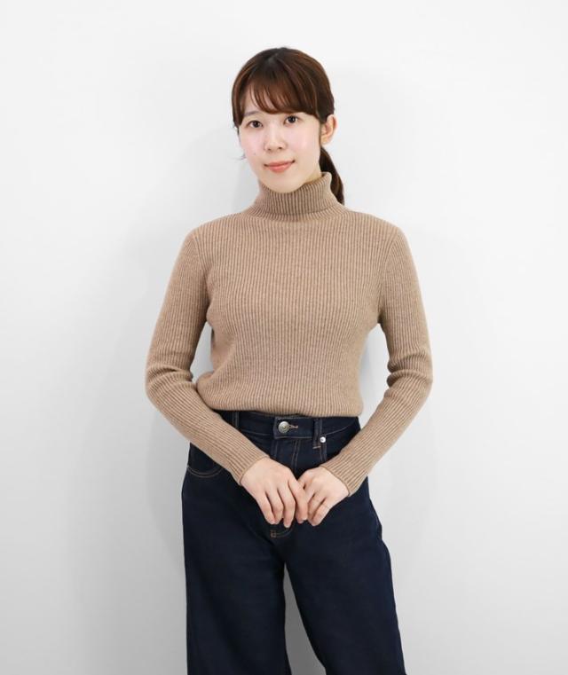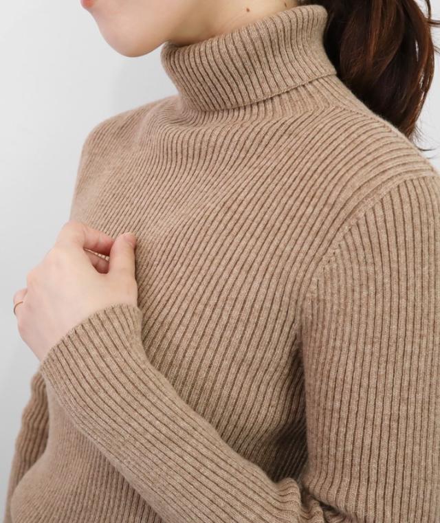 ソフトな肌触りのカシミヤとストレッチ糸を合わせた素材で作ったタートルネックセーターです。
