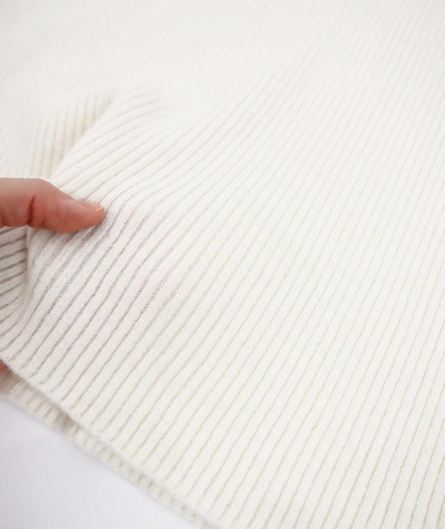 編地は12ゲージのリブ編みを採用しています。伸縮性があり身体にフィットするので快適な着心地。薄手で上品な印象に仕上げました。淡色はやや透け感があります。