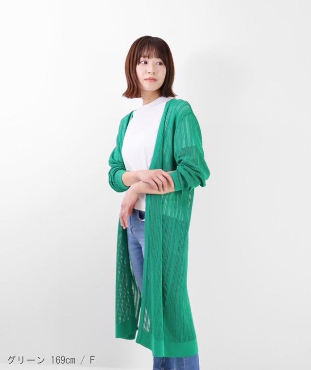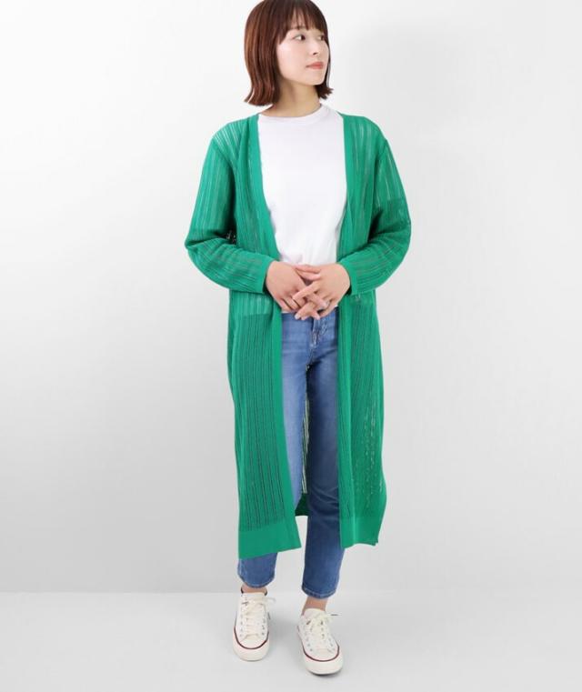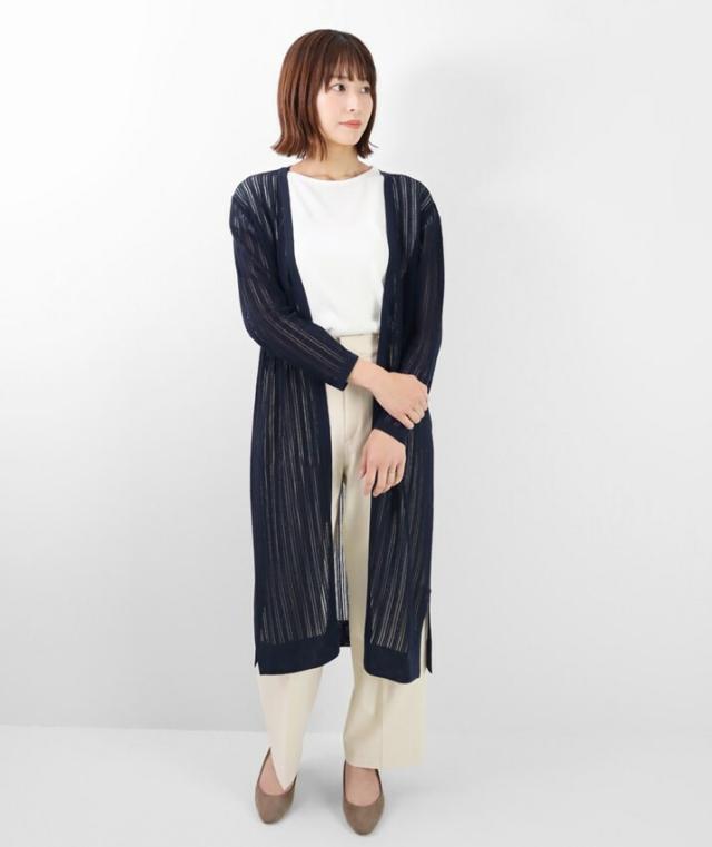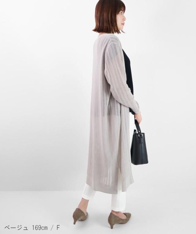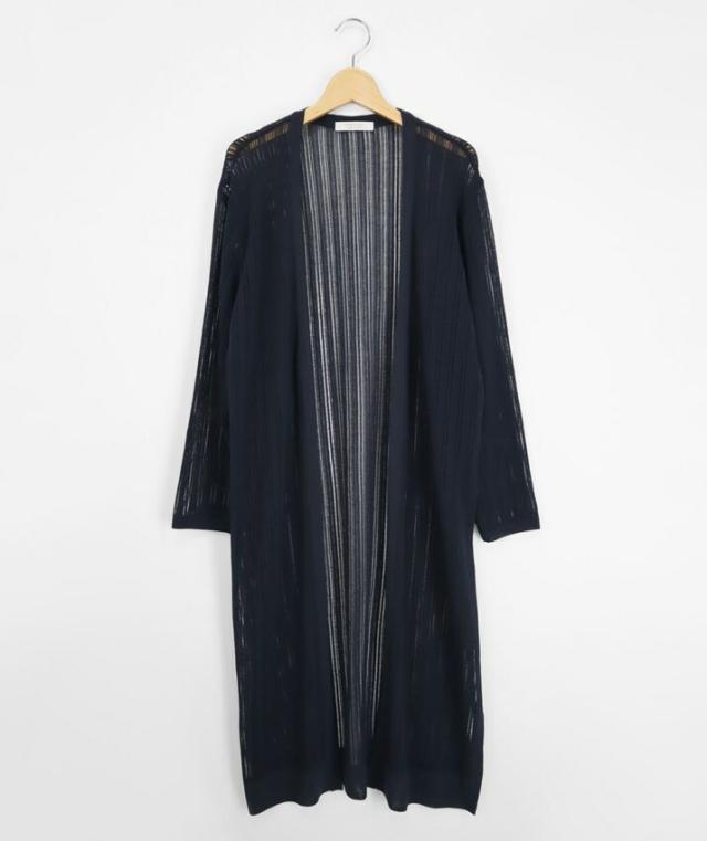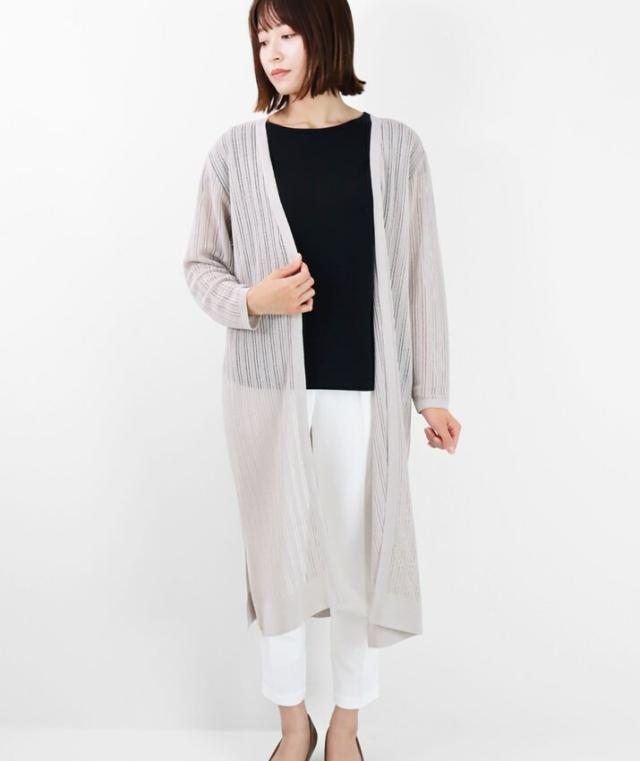 清涼感のある繊細でハリのある糸を使用した透かし編み柄のロングカーディガン。コットン混のドライタッチな風合いで暑い季節でもさっぱりと心地よく着ていただけます。
