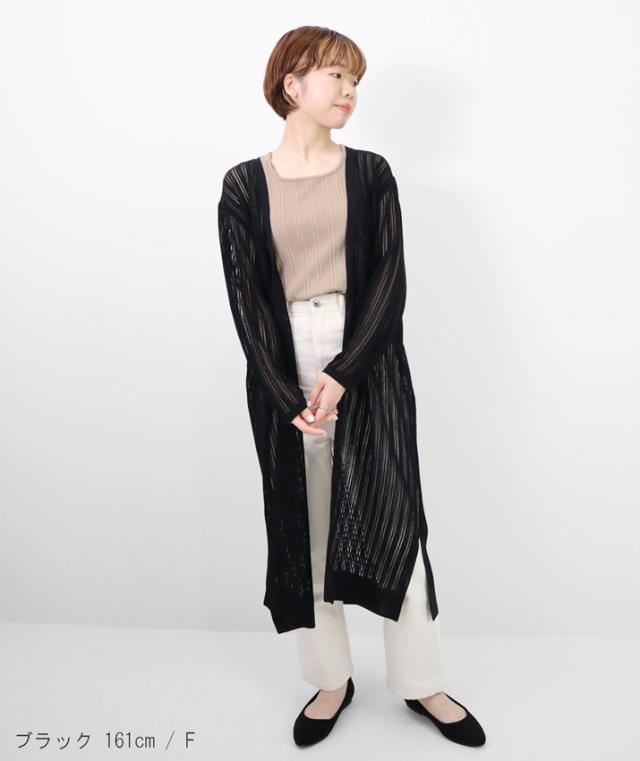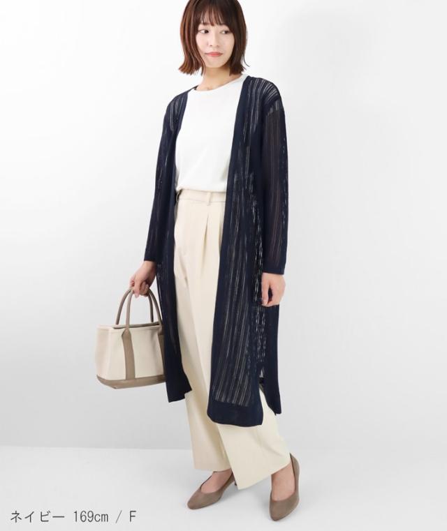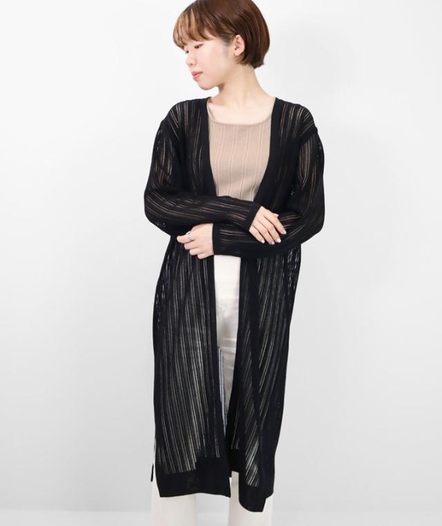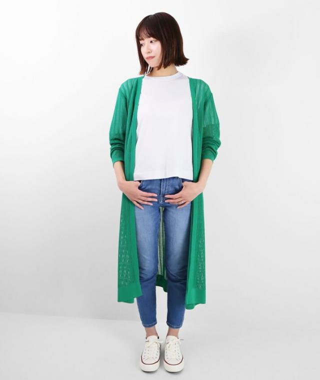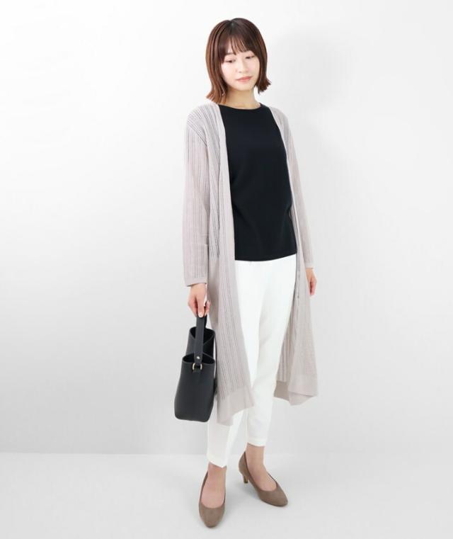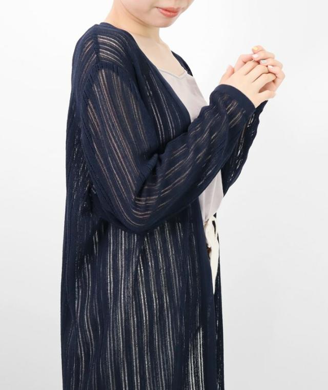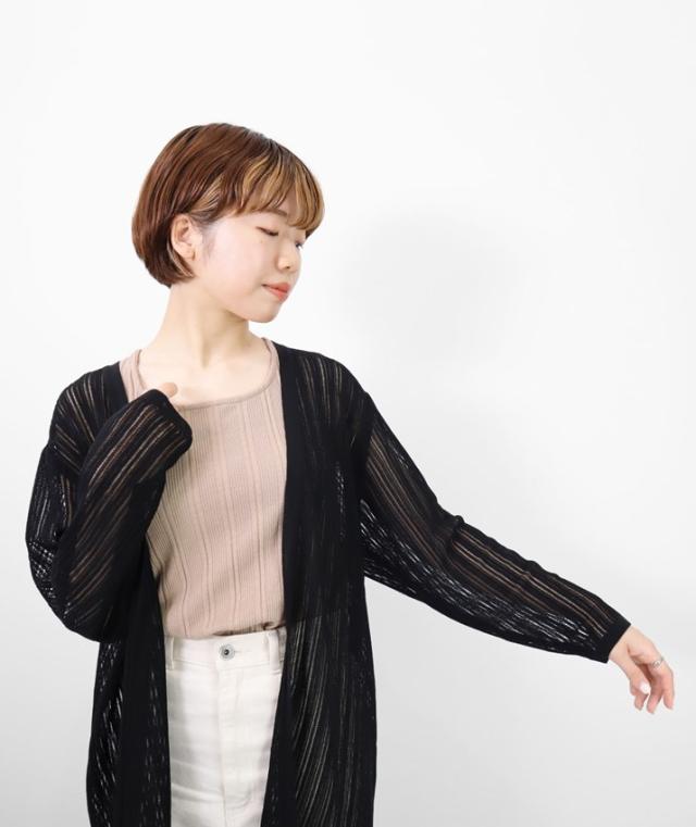清涼感のある繊細でハリのある糸を使用した透かし編み柄のロングカーディガン。コットン混のドライタッチな風合いで暑い季節でもさっぱりと心地よく着ていただけます。