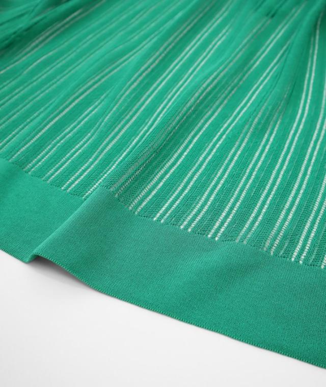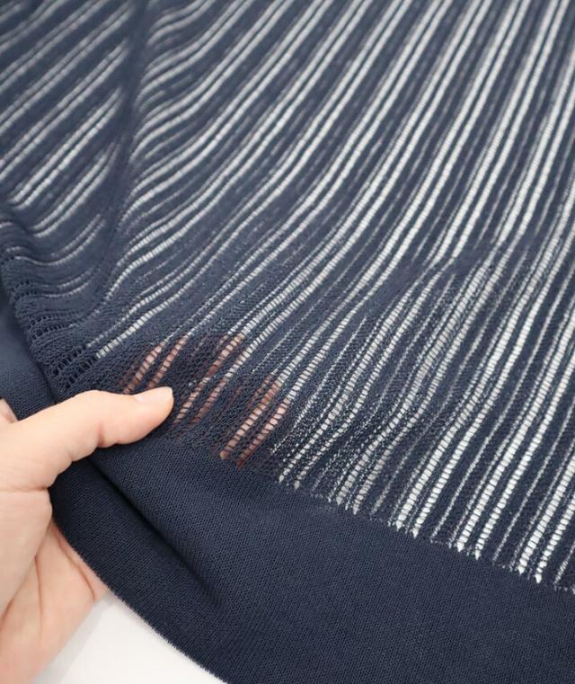 ストライプ状に入った編み柄の透け感が涼しげで、季節感のある軽快なスタイリングに。シャリっとした素材は肌離れも良く、真夏も快適に着ていただけます。