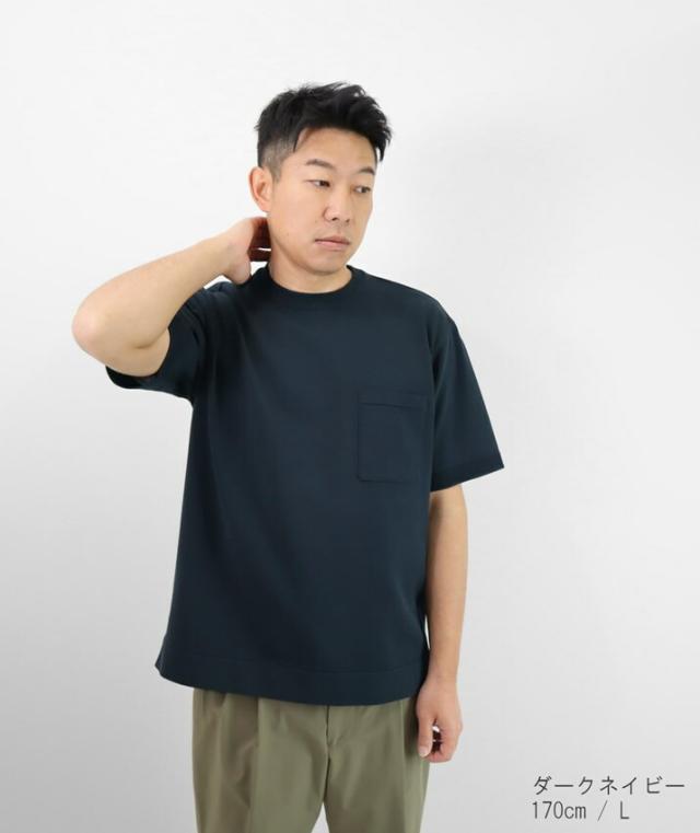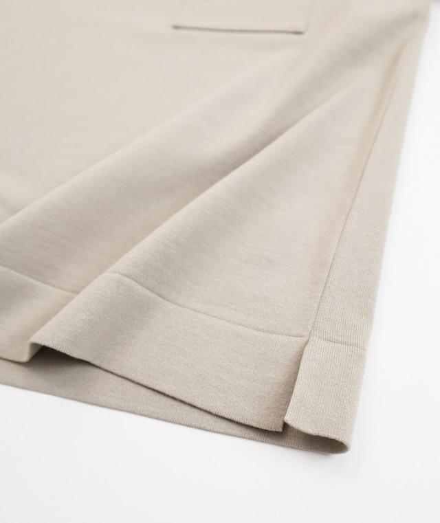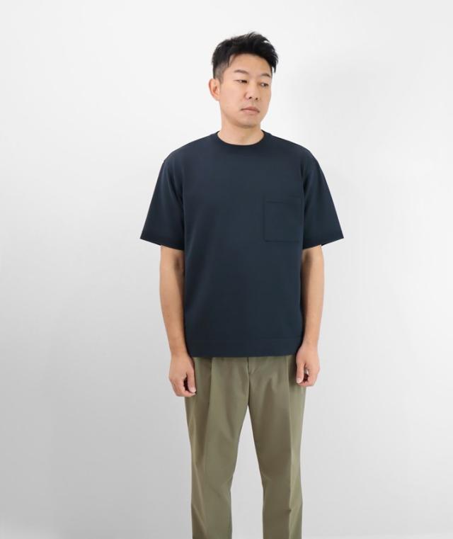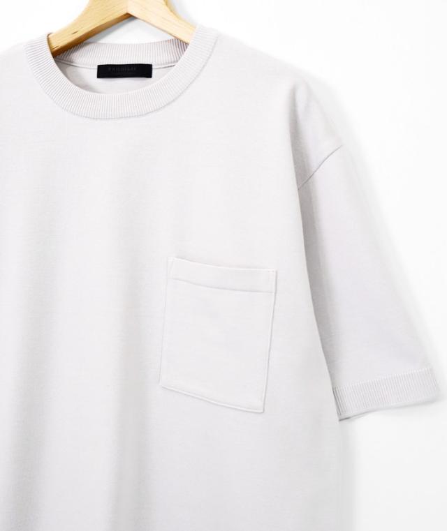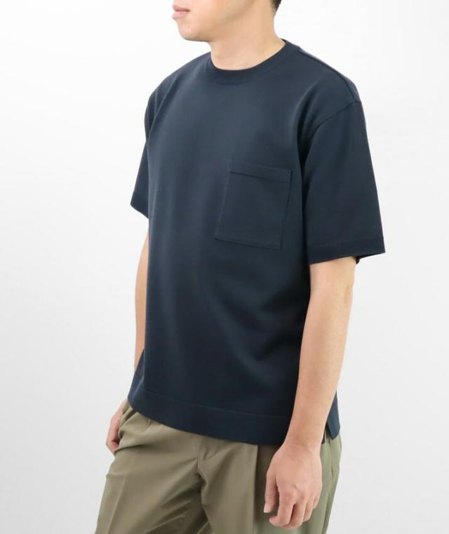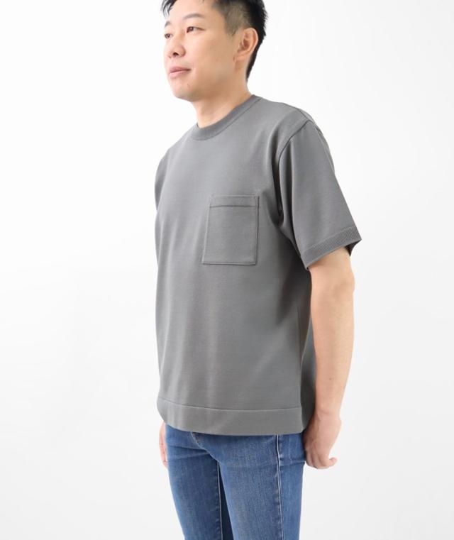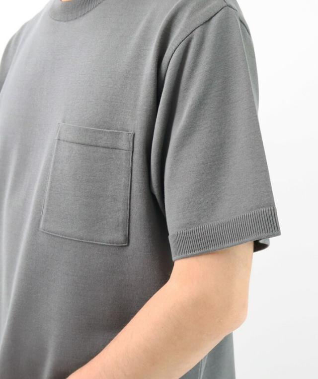 定番人気のポケット付きTシャツをさらりとした素材のニットで作りました。シンプルなデザインの中に、衿ぐりや袖口のリブ組織がアクセントになっています。