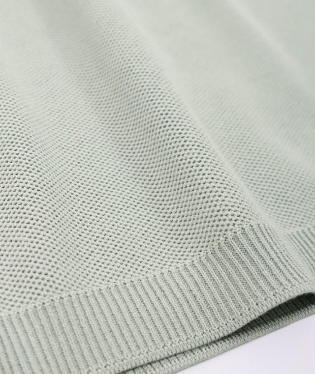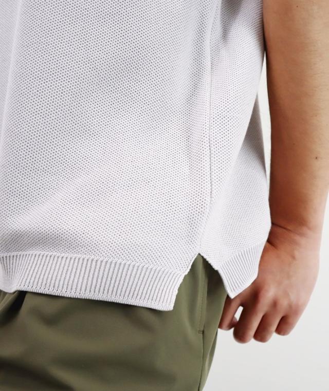 編地は14ゲージ。ハチの巣のような六角形の凸凹が特徴の編地で、肌との接地面が少なく通気性に優れています。
