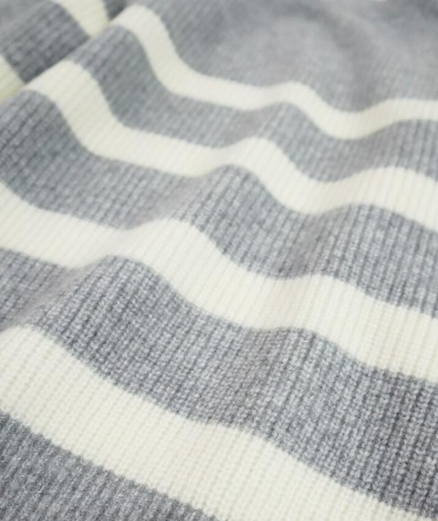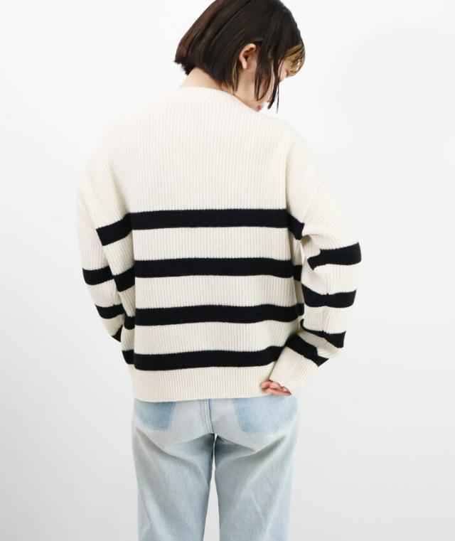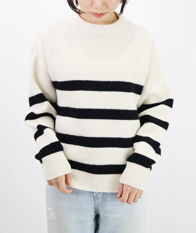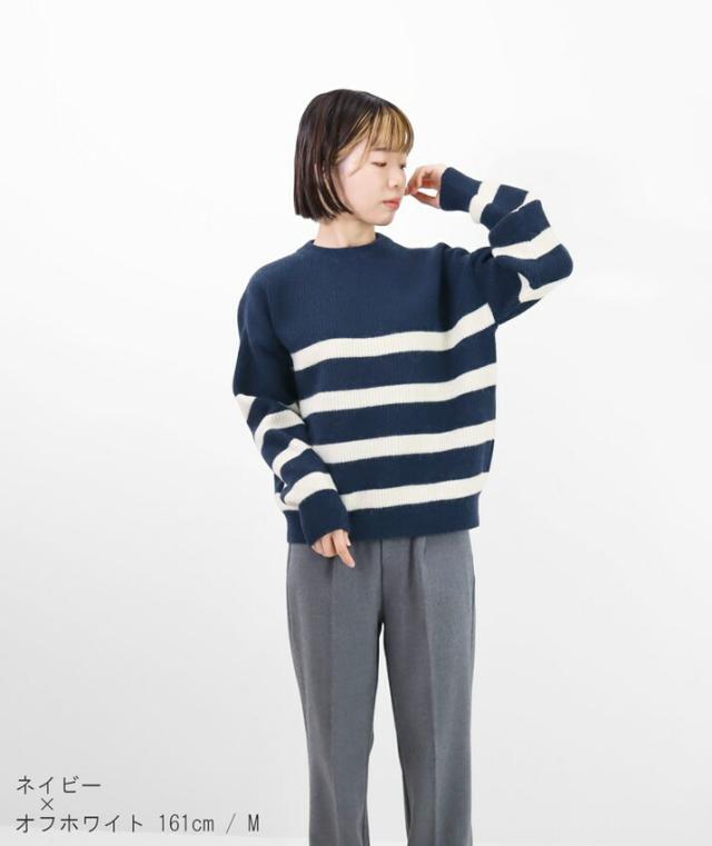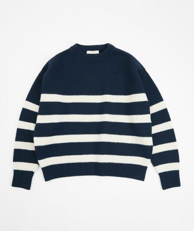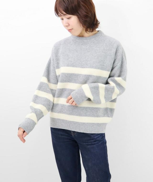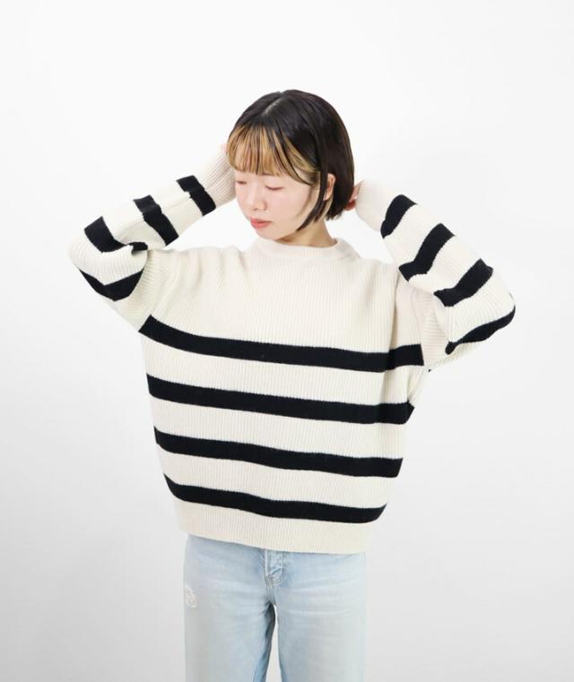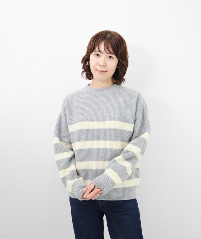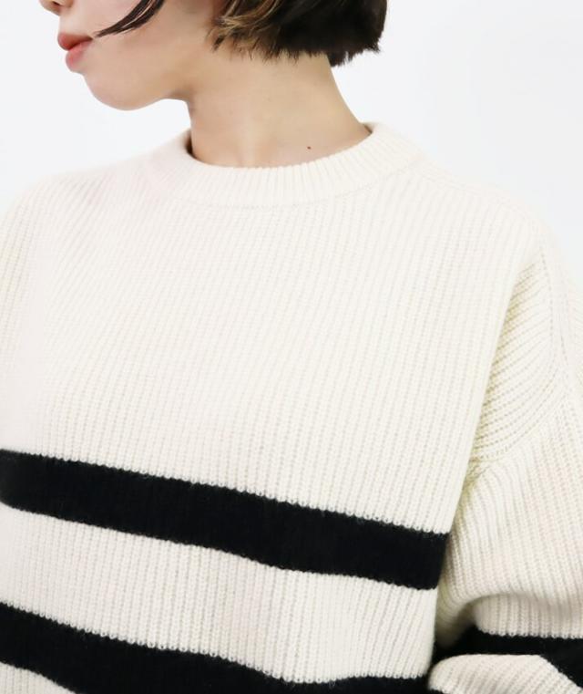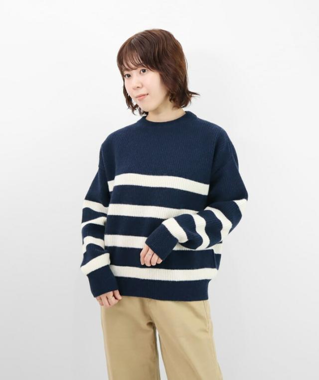 シェットランドタイプのバルキー性のあるウールに、ソフトなカシミヤをブレンドした素材でつくったボーダー柄の畦編みクルーネックセーターです。