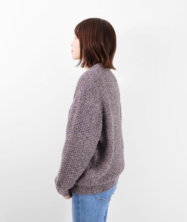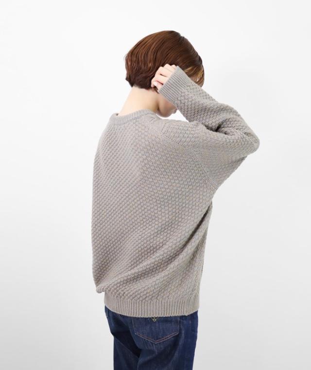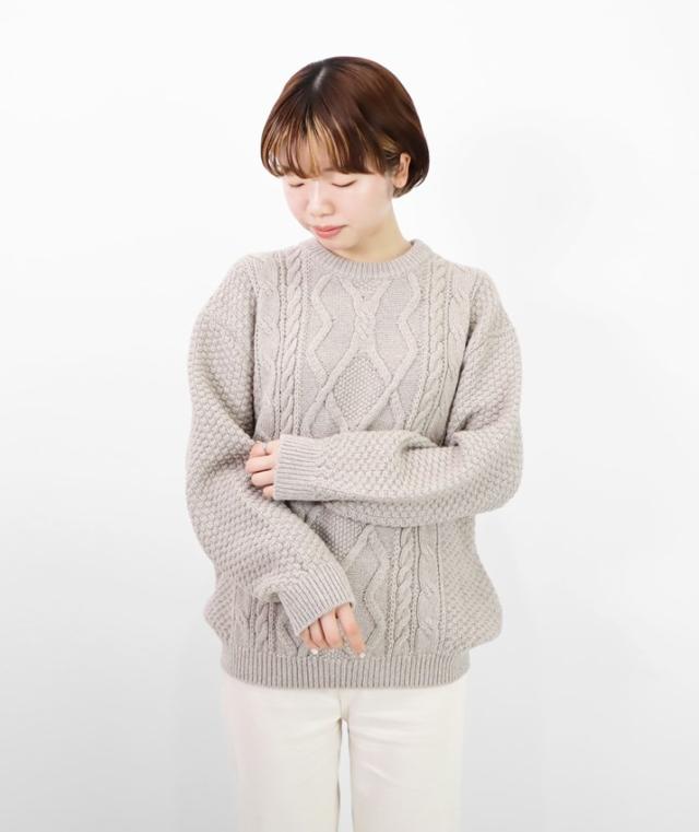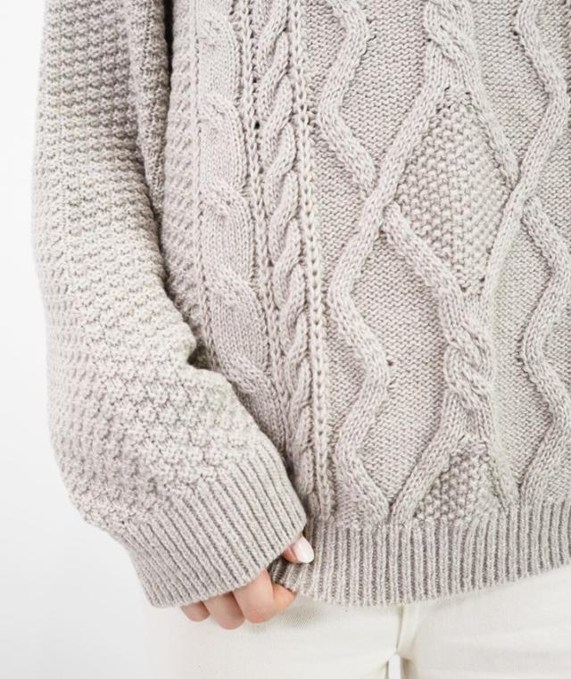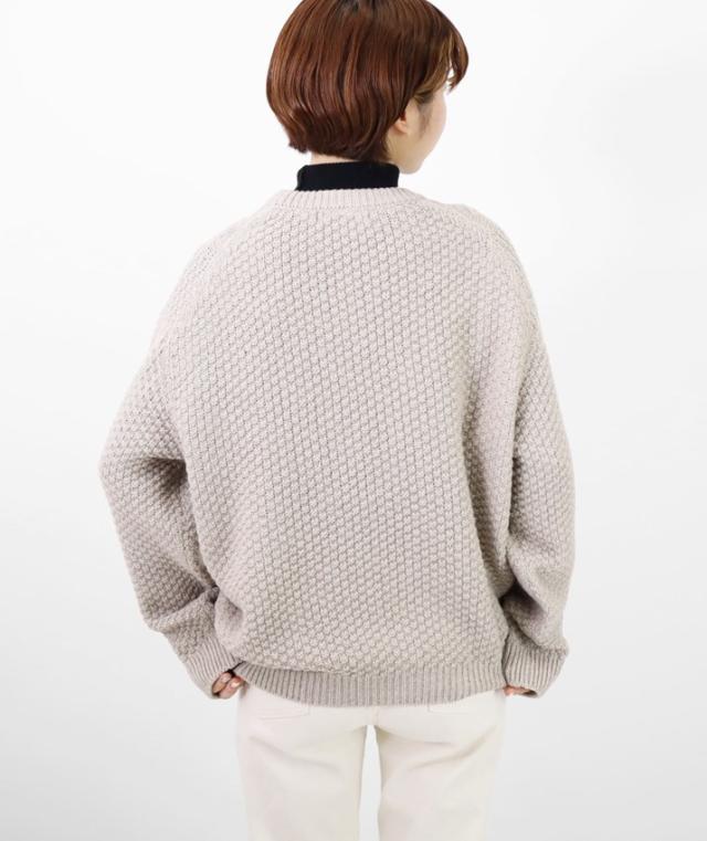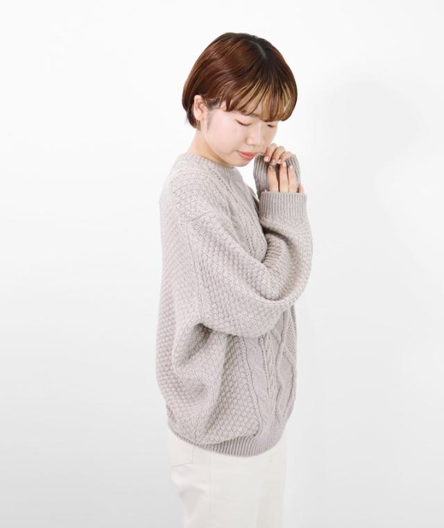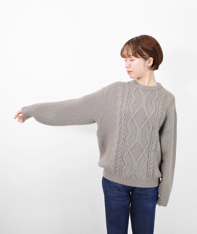 ざっくりした編み目で前身頃の立体的なケーブル編みが目を引く、存在感抜群の1枚です。袖と後身頃は鹿の子編みにすることで、カジュアル過ぎない印象に。糸に膨らみがあるため柄の凹凸感がより引き立ちます。
