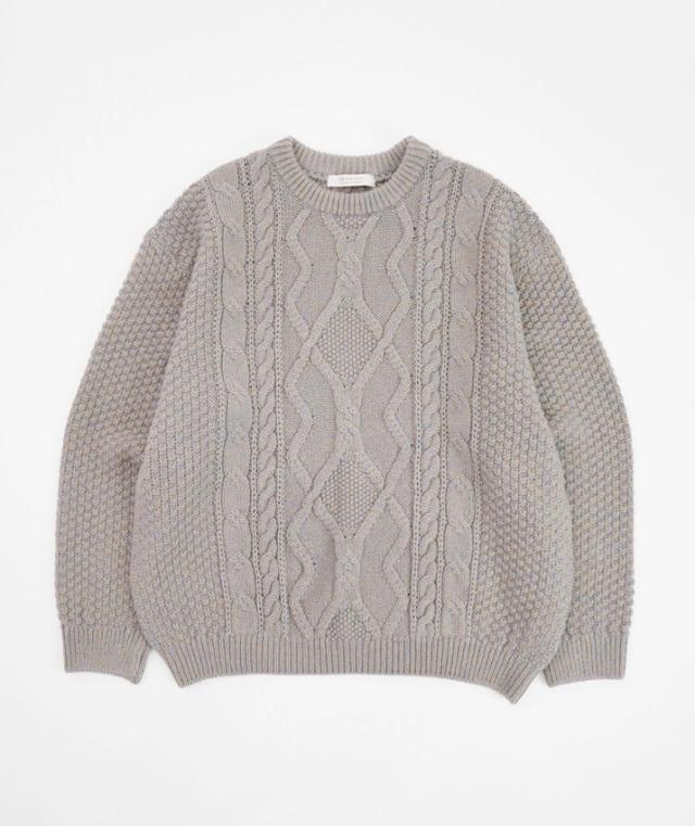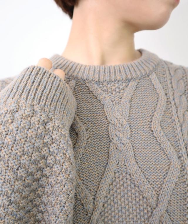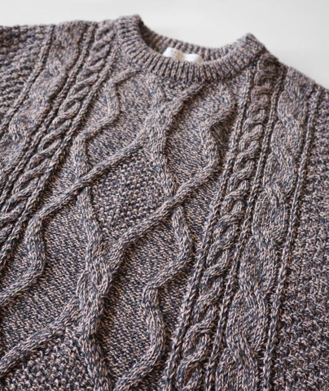 ミックスカラーの糸を使用した大きめのケーブル柄が特徴的なニットプルオーバーです。