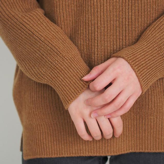 しっかりとした厚みのあるローゲージニットでボリューム感がありますが、ウール素材のものと比べて軽い着心地です。