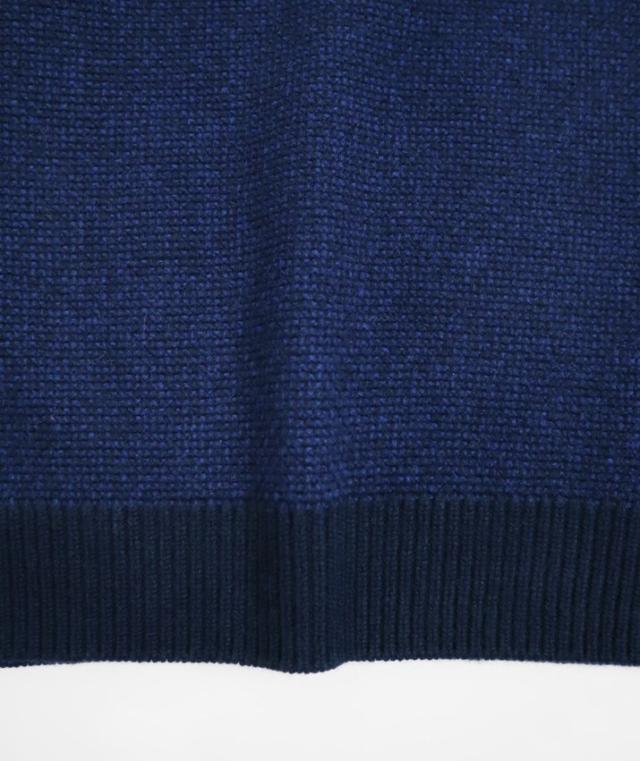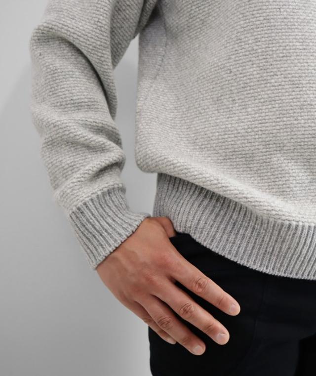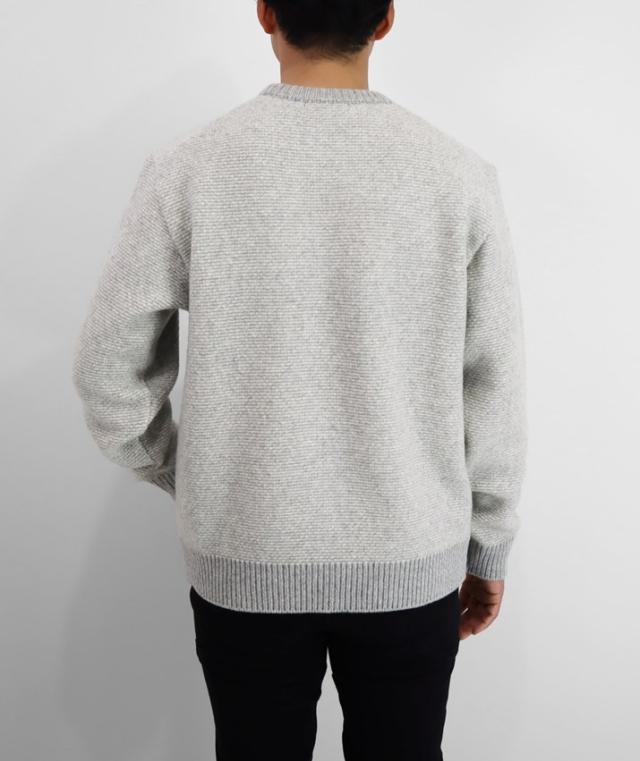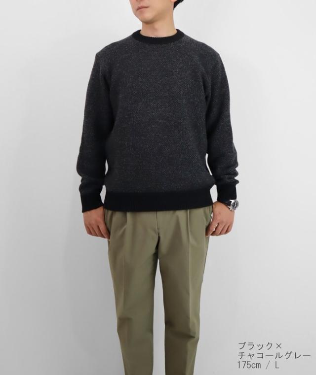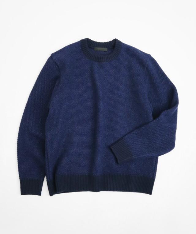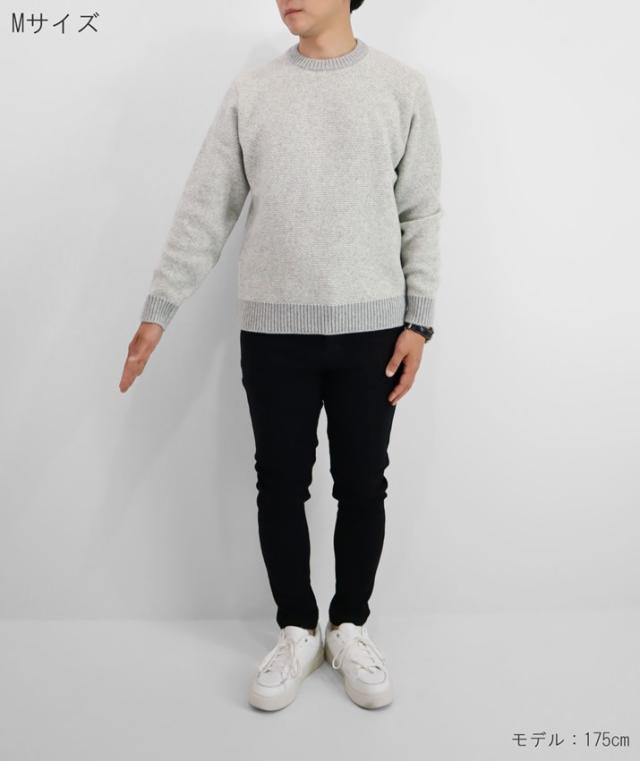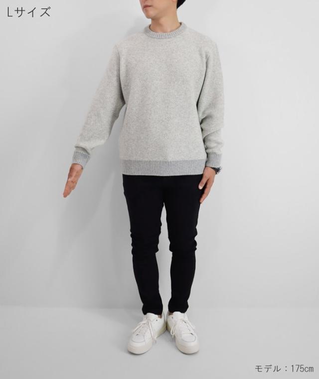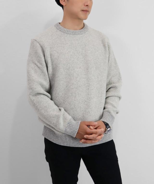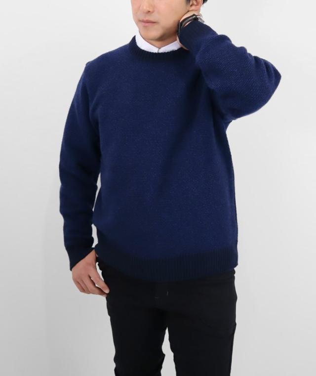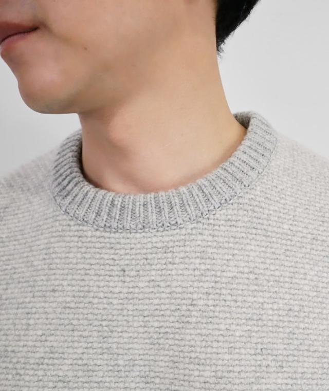 形はベーシックなクルーネックセーターですが、編地やカラーにほんの少し遊び心があるのでシンプルながらも存在感があります。中厚手のニットは程よい厚みで春や秋の1枚着はもちろん、真冬はシャツとのレイヤードも可能。