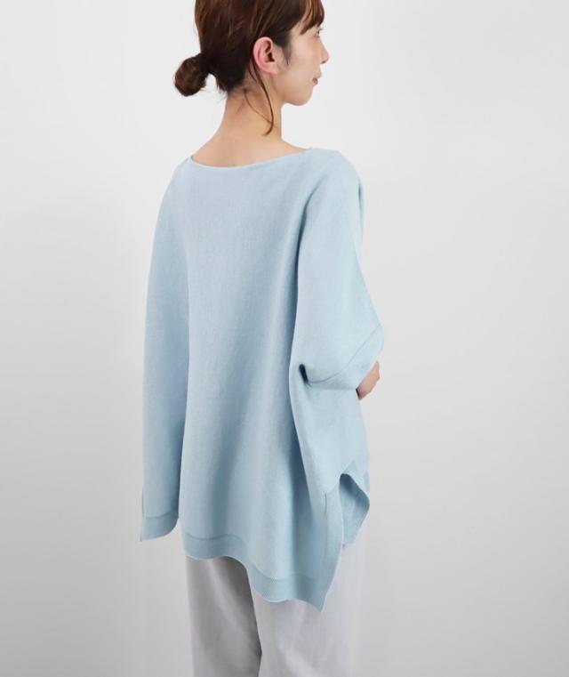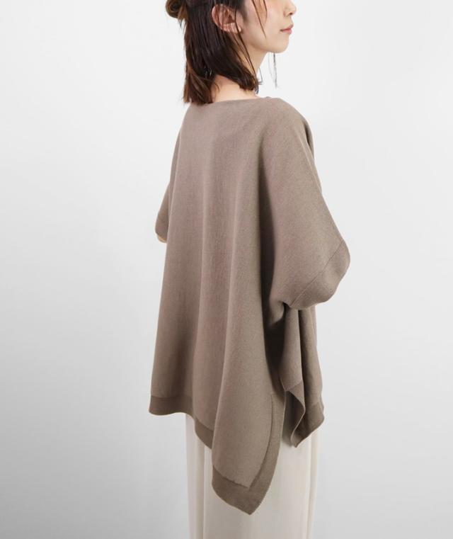 ワイドな身幅と前後差のある裾が、気になる二の腕や腰まわりを自然にカバーしてくれます。ゆったりとしたシルエットながらも落ち感があるため、着ぶくれせずすっきりとして見えます。ガーター編みに切り替えた袖口と裾がさりげないアクセントに。
