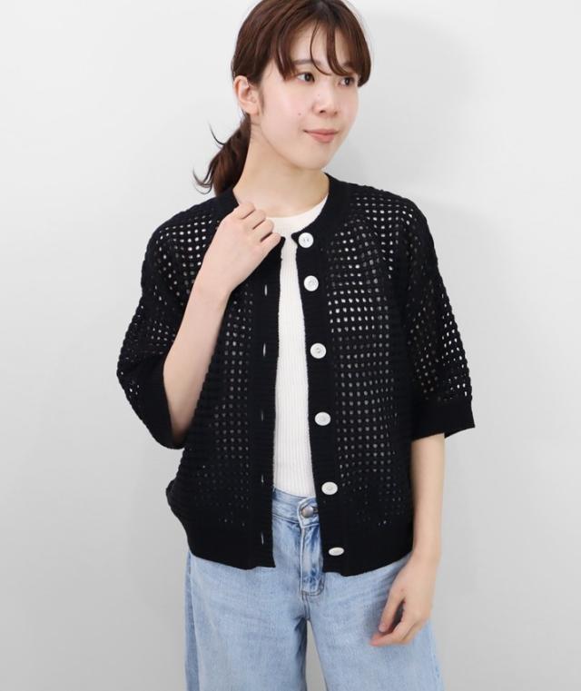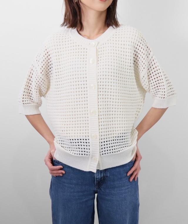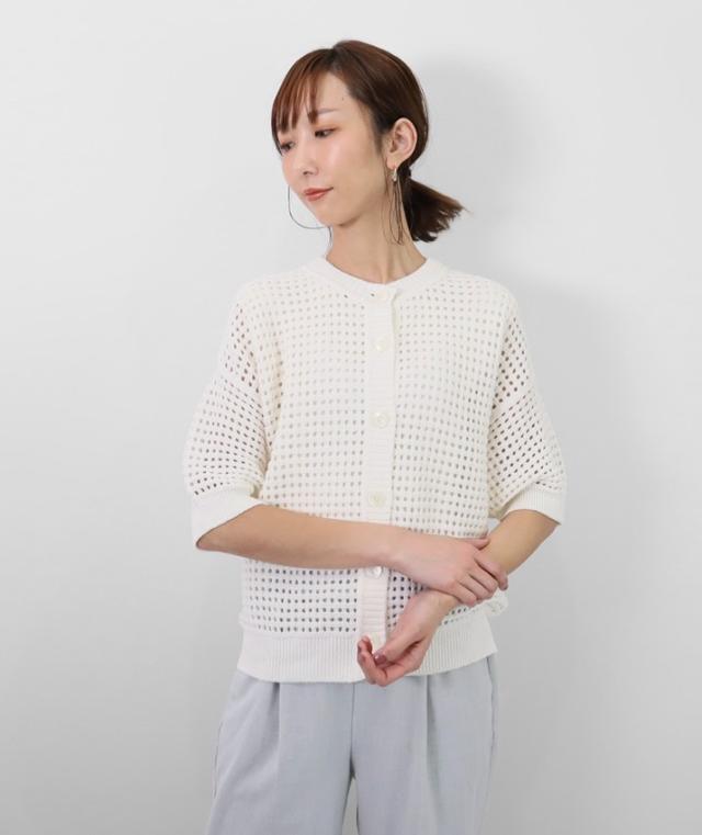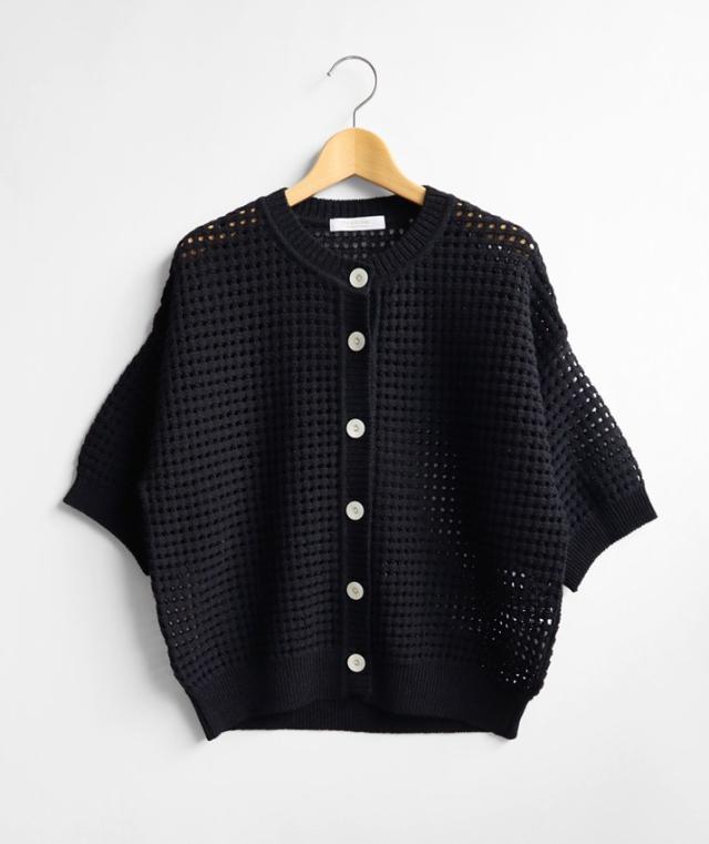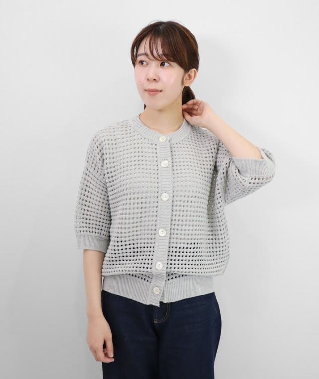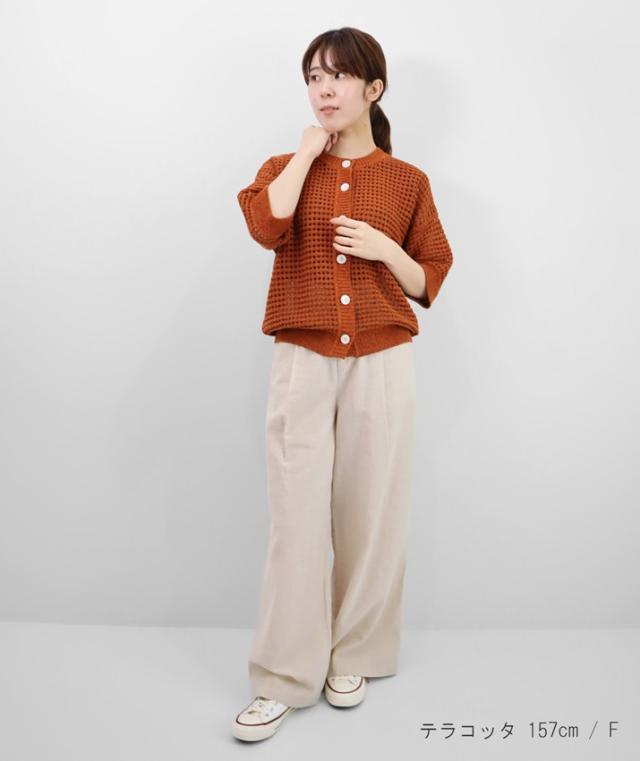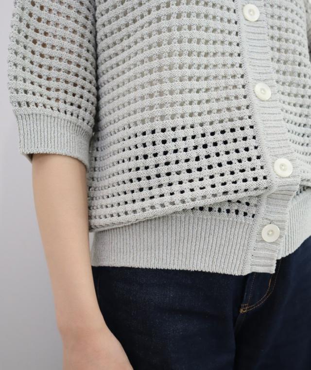 夏らしいリネン混素材で作った、メッシュ編みのカーディガンです。ざっくりした編地で風通しがよく、肌離れもいいので汗をかいてもベタつきません。半袖でも長めの袖丈だから、真夏はもちろんまだ暑い初秋まで活躍してくれるサマーニットです。