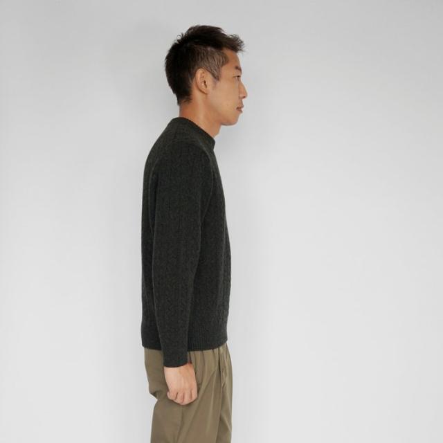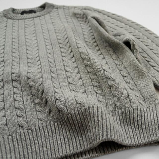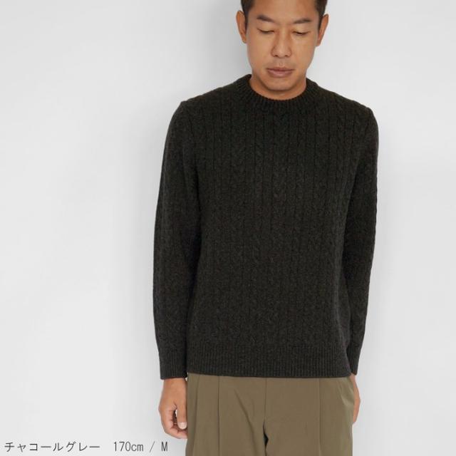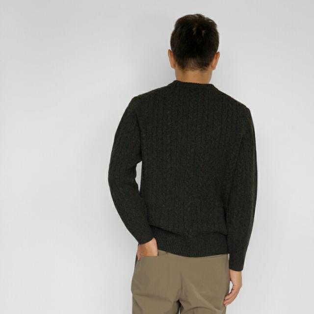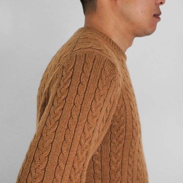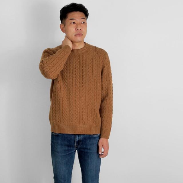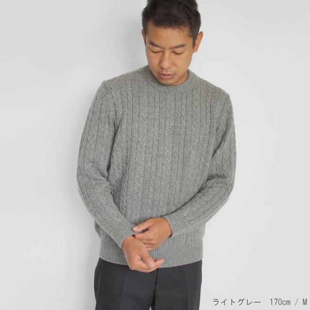 カシミヤ100%素材を使用した、軽くてあったかい細ケーブル柄のメンズクルーネックセーターです。しっかりとした厚みとニットらしさのある立体的なケーブル編みのデザインが特徴です。