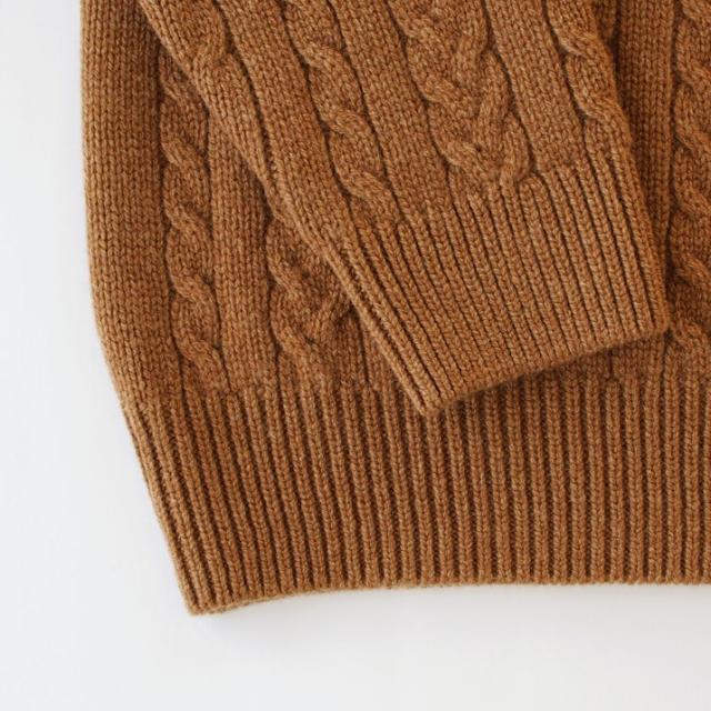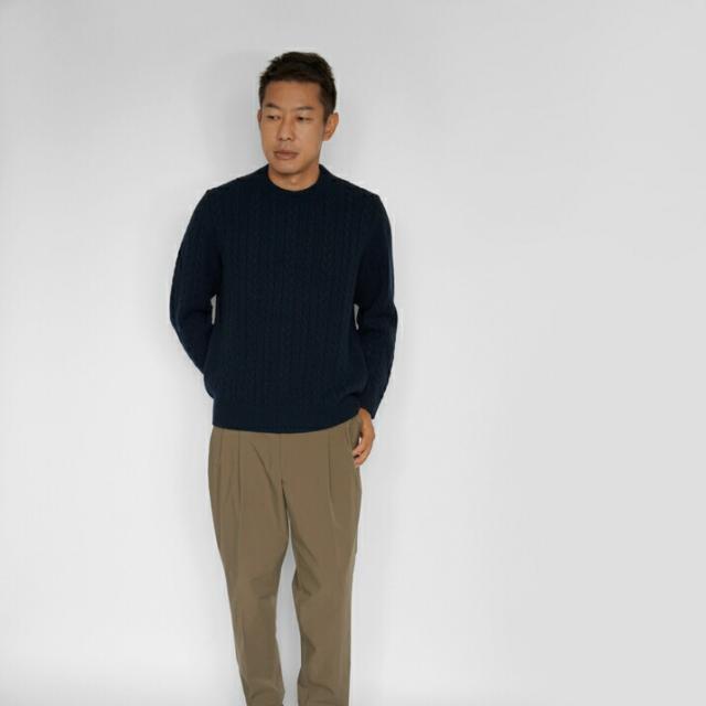 細めのケーブル柄のデザインはカジュアルになりすぎないから、シャツやジャケットなどのきれい目スタイルにも合わせやすく、スタイリングの幅が広がります。