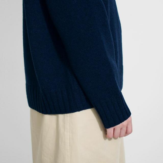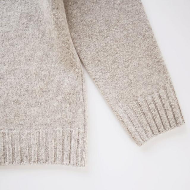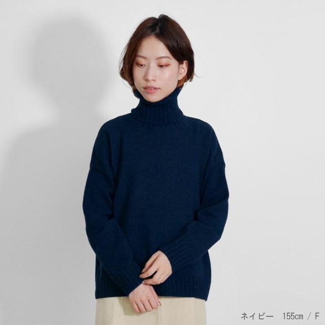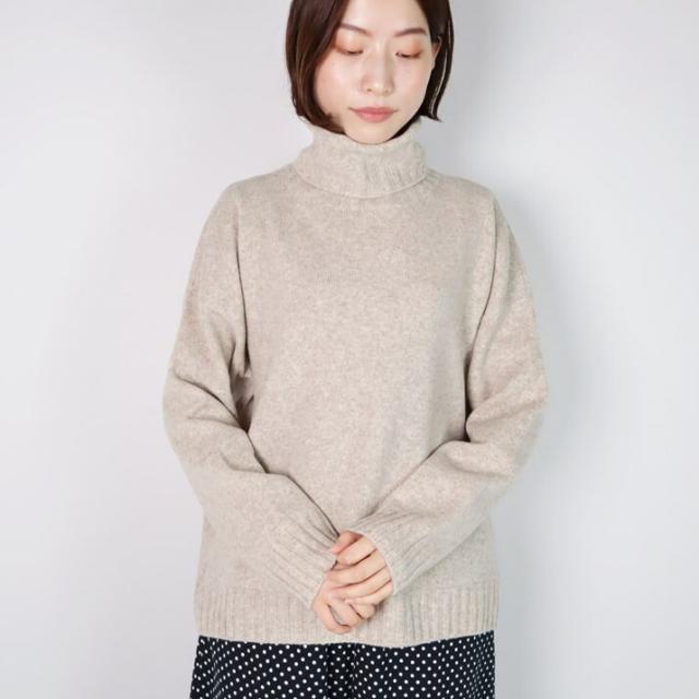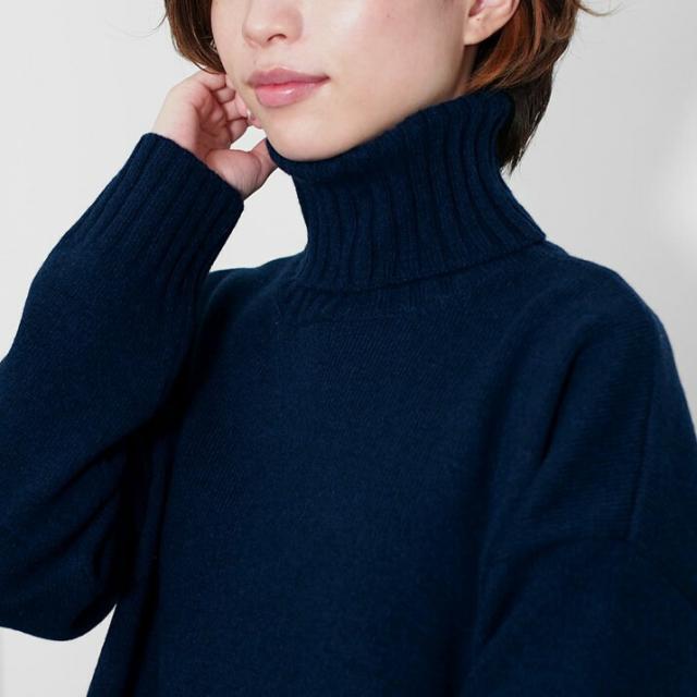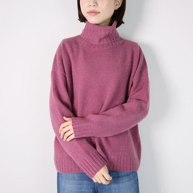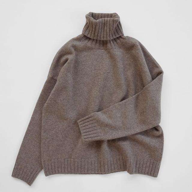 シェットランドタイプのバルキー性のあるウールに、ソフトなカシミヤをブレンドした素材でつくったタートルネックセーター。