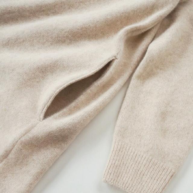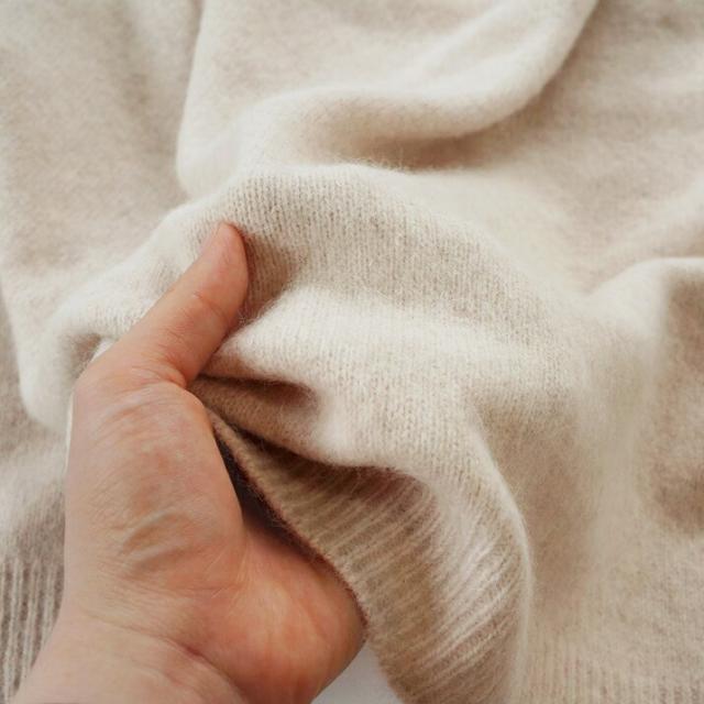 編地は7ゲージの天竺編みを採用。ふっくらとしたボリュームのある風合いのラクーンニットは、ふわふわの毛の間に空気をたっぷりと含み保温性も高めてくれます。