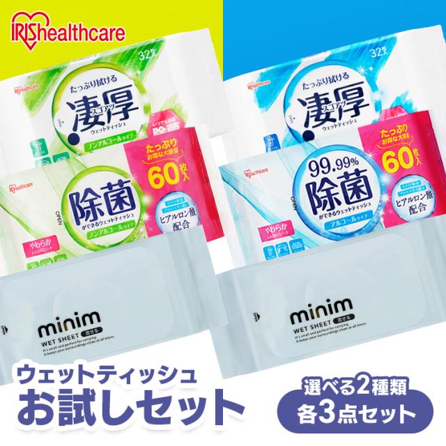 【お試しセット】 ウェットティッシュ 除菌シート アルコール ノンアルコール 除菌 携帯 持ち運び ウェットシート 掃除 アウトドア お出かけ 防災 ウエットティッシュ アイリスオーヤマ WTS-60A/N3P 厚手 凄厚 WTP-32A/N3P ミニ minim POF-6PN *