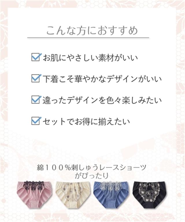 【綿100% 刺しゅうレースショーツ4枚組】br> ■綿100%レーシーショーツはこんな方におすすめ ●お肌にやさしい素材がいい ●下着こそ華やかなデザインがいい ●違ったデザインをいろいろ楽しみたい ●セットでお得に揃えたい ■天然素材 コットン100% 下着の刺激やムレが気になる方に。 体のデリケートな部分に直接触れるショーツだからこそ、通気性良く肌ざわりのやさしい綿100%をおすすめします。 ■綿ならではのサラッとした通気性の良さ 綿は通気性に優れ、吸湿性もあるのでさらりと快適なはき心地が特徴。 ムレやすいデリケートな部分だからこそ、肌ざわりにこだわった天然素材をおすすめします。 ■絶妙カラーの4枚組 フロントを彩る華やかな刺しゅうレースと生地色の配色がおしゃれ見え! 豪華なレースも気分があがります。 ■レース裏とクロッチ裏も綿100%でさらに肌ざわりやさしく 裏に綿100%の生地を重ねることで、デリケートな部分に透け防止と優しさを。 綿生地は通気性もあり、ムレにくい。※クロッチ裏の色は身生地と同系色です。 ※商品の色移りを防止するために個包装を行っている場合がございます。 個包装はプラスチック削減のため一部の色のみに使用し