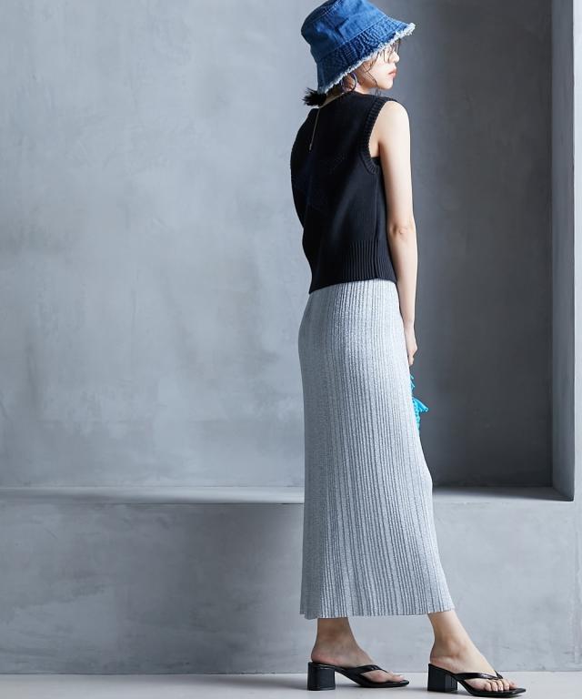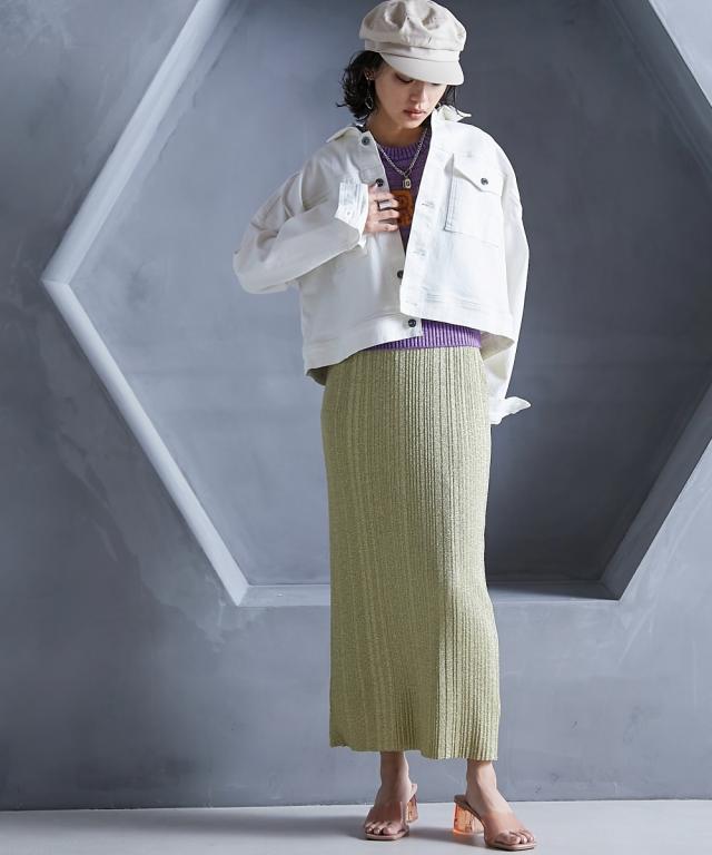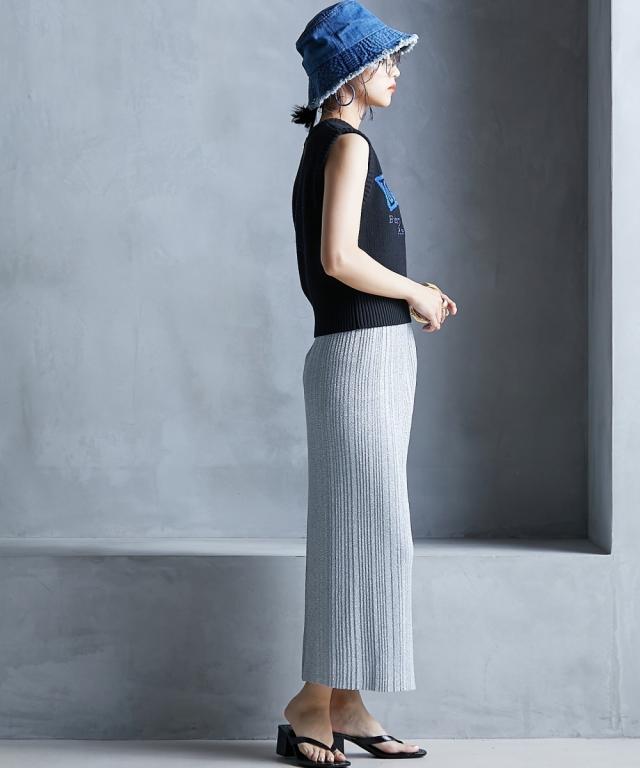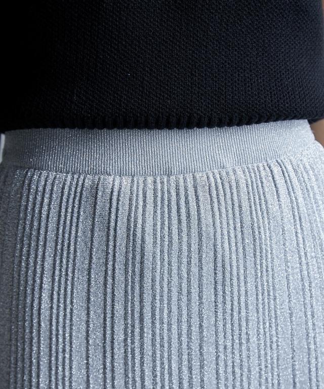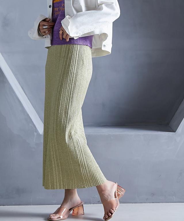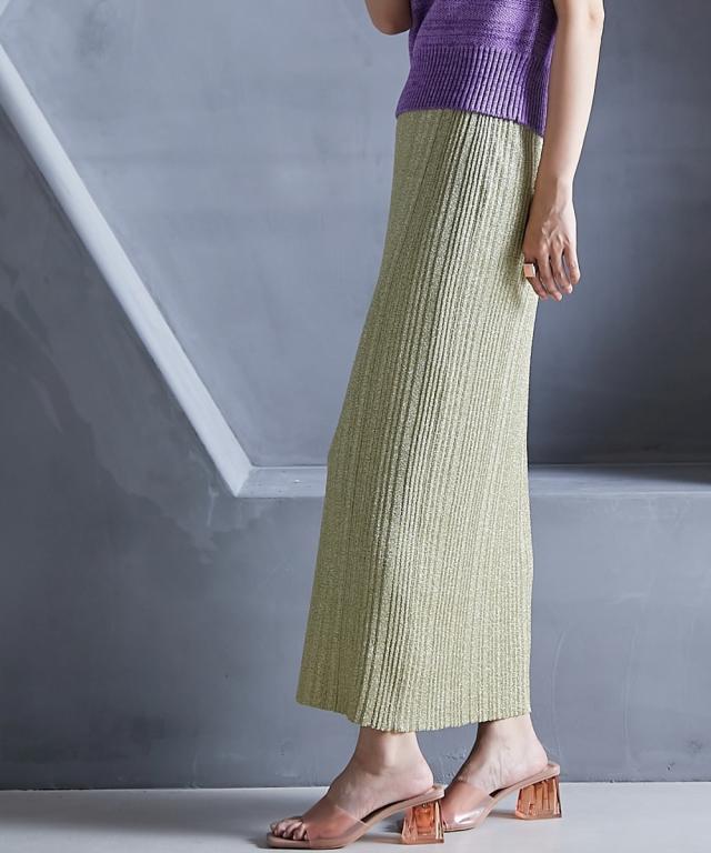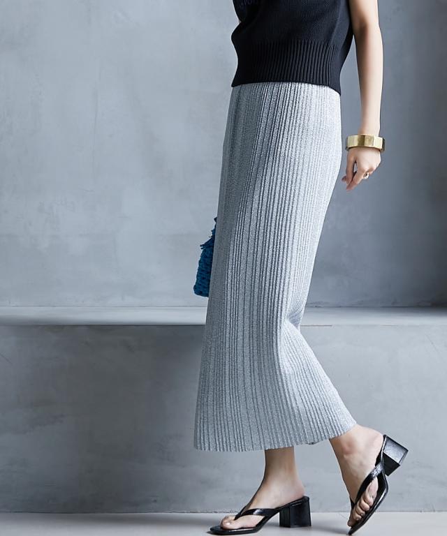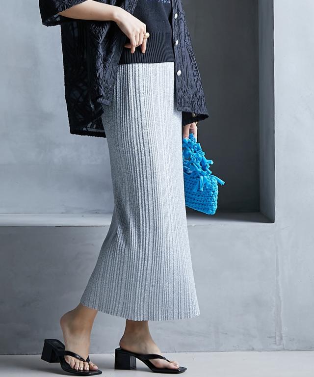 トレンド感のあるラメタイトスカート。 ■デザイン スタイリングを華やかにしてくれるラメニットスカート。 挑戦しやすい控えめで合わせやすいカラー展開です。 すっきり細身のシルエットですが締め付けない編地を使用しているので窮屈感なく、きれいなシルエットで履いていただけます。 裏地をつけているので滑りがよく体のラインも拾いにくいです。 ■素材 ソフトラメ糸を使用。 ■おすすめのスタイリング 明るいトーンで軽く春夏らしく、あえてTシャツなどのカジュアルなスタイルで着こなしたいアイテムです。