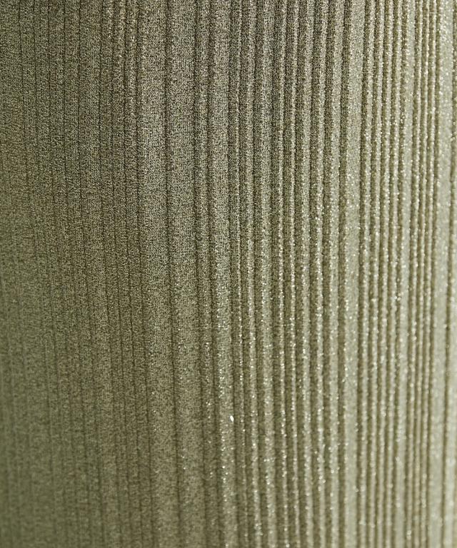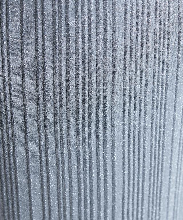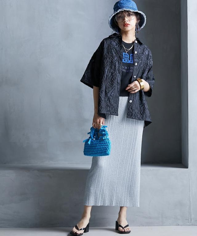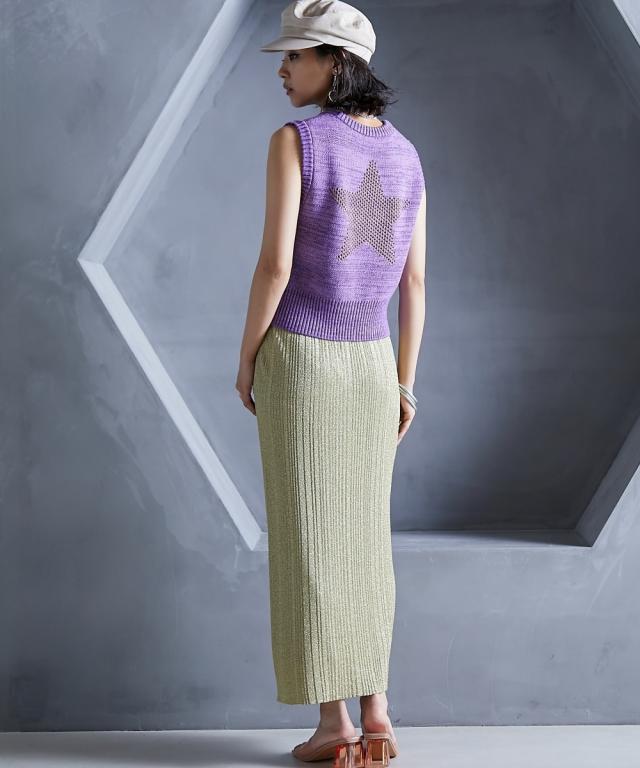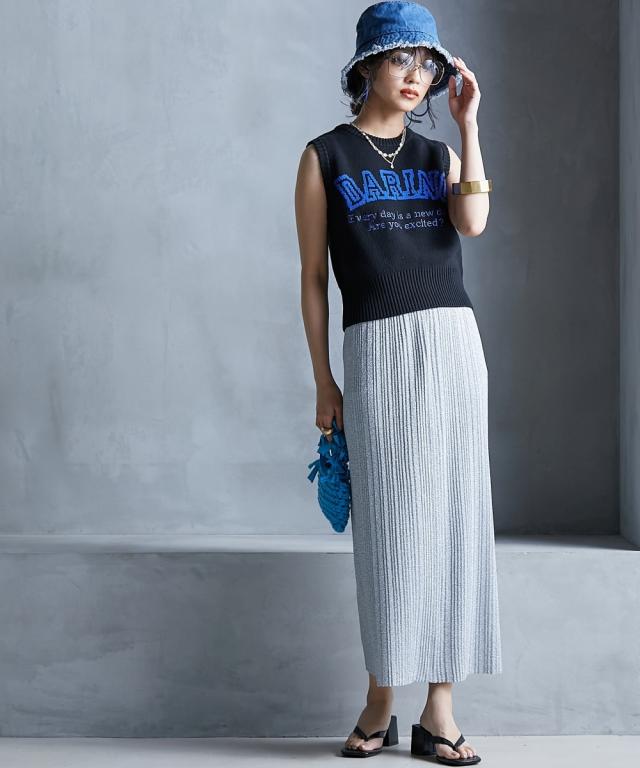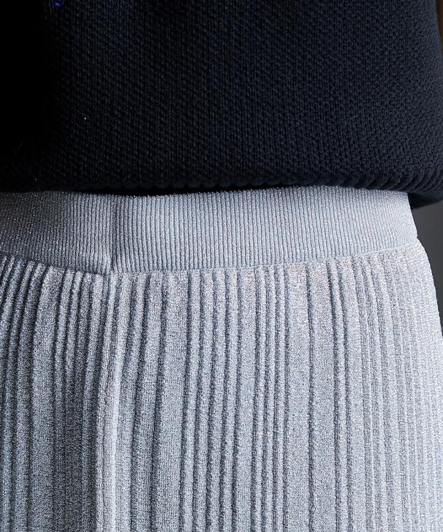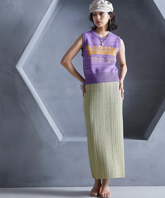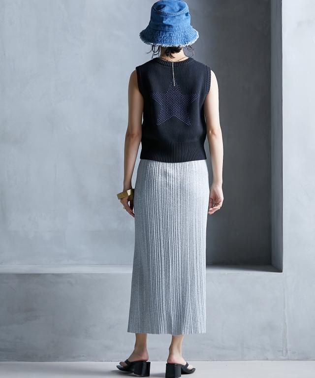 トレンド感のあるラメタイトスカート。 ■デザイン スタイリングを華やかにしてくれるラメニットスカート。 挑戦しやすい控えめで合わせやすいカラー展開です。 すっきり細身のシルエットですが締め付けない編地を使用しているので窮屈感なく、きれいなシルエットで履いていただけます。 裏地をつけているので滑りがよく体のラインも拾いにくいです。 ■素材 ソフトラメ糸を使用。 ■おすすめのスタイリング 明るいトーンで軽く春夏らしく、あえてTシャツなどのカジュアルなスタイルで着こなしたいアイテムです。