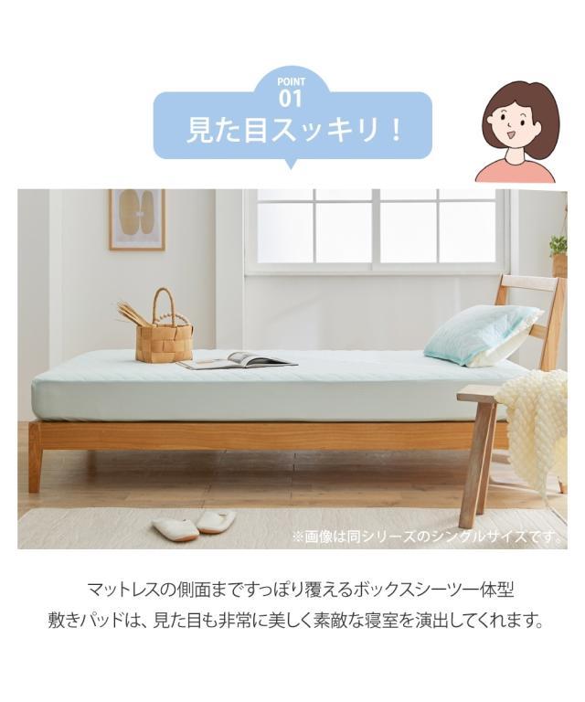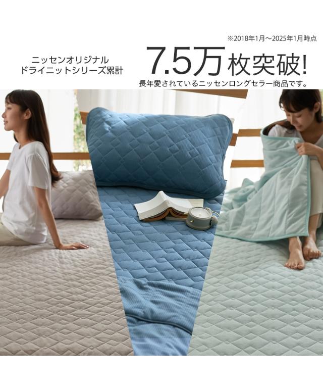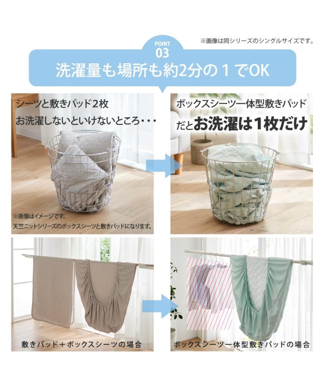 季節に関係なく人は寝ている間、一晩にコップ1杯の汗をかくといわれている中、寝ている間の汗を吸収し素早く放出することでムレにくくしてくれるドライニット。敷パッドとボックスシーツが一緒になったボックスシーツ型敷パッドはマットレス・敷布団両方に装着できます。マットレス・敷布団をすっぽり覆うので、寝相が悪くてもズレにくく見た目もすっきり。