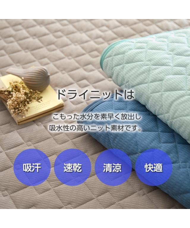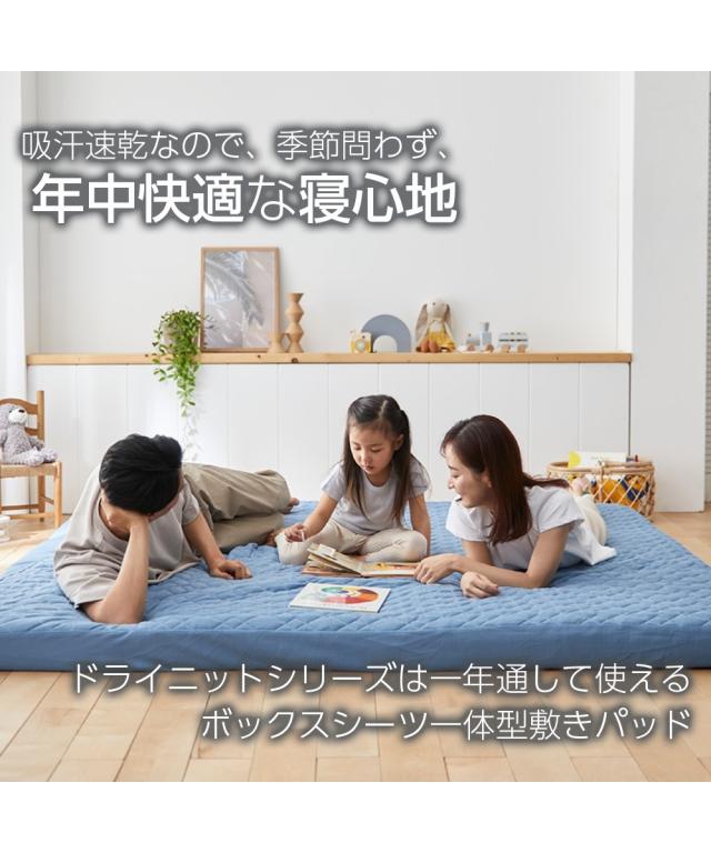季節に関係なく人は寝ている間、一晩にコップ1杯の汗をかくといわれている中、寝ている間の汗を吸収し素早く放出することでムレにくくしてくれるドライニット。敷パッドとボックスシーツが一緒になったボックスシーツ型敷パッドはマットレス・敷布団両方に装着できます。マットレス・敷布団をすっぽり覆うので、寝相が悪くてもズレにくく見た目もすっきり。