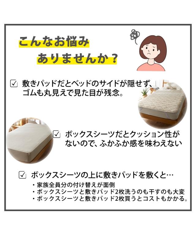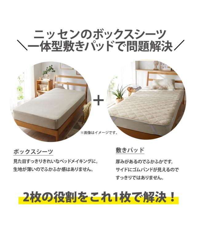 季節に関係なく人は寝ている間、一晩にコップ1杯の汗をかくといわれている中、寝ている間の汗を吸収し素早く放出することでムレにくくしてくれるドライニット。敷パッドとボックスシーツが一緒になったボックスシーツ型敷パッドはマットレス・敷布団両方に装着できます。マットレス・敷布団をすっぽり覆うので、寝相が悪くてもズレにくく見た目もすっきり。