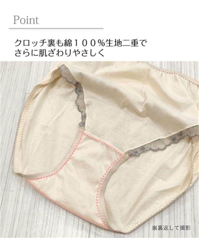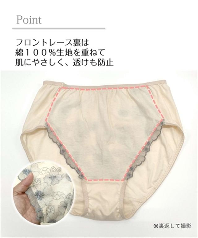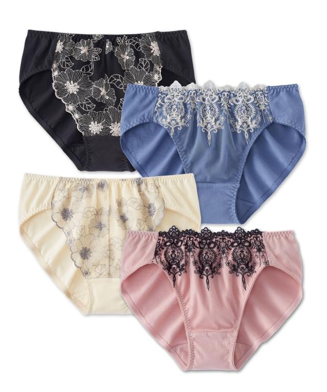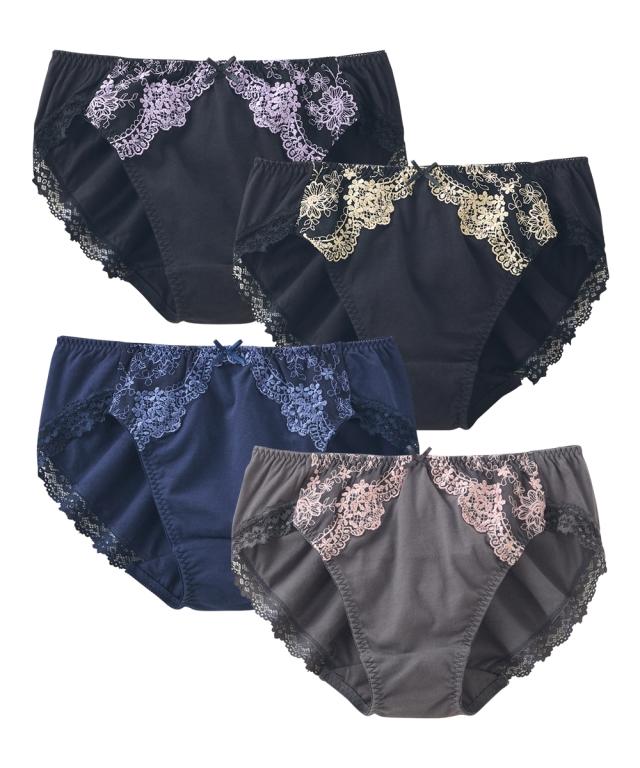【綿100% 刺しゅうレースショーツ4枚組】br> ■綿100%レーシーショーツはこんな方におすすめ ●お肌にやさしい素材がいい ●下着こそ華やかなデザインがいい ●違ったデザインをいろいろ楽しみたい ●セットでお得に揃えたい ■天然素材 コットン100% 下着の刺激やムレが気になる方に。 体のデリケートな部分に直接触れるショーツだからこそ、通気性良く肌ざわりのやさしい綿100%をおすすめします。 ■綿ならではのサラッとした通気性の良さ 綿は通気性に優れ、吸湿性もあるのでさらりと快適なはき心地が特徴。 ムレやすいデリケートな部分だからこそ、肌ざわりにこだわった天然素材をおすすめします。 ■絶妙カラーの4枚組 フロントを彩る華やかな刺しゅうレースと生地色の配色がおしゃれ見え! 豪華なレースも気分があがります。 ■レース裏とクロッチ裏も綿100%でさらに肌ざわりやさしく 裏に綿100%の生地を重ねることで、デリケートな部分に透け防止と優しさを。 綿生地は通気性もあり、ムレにくい。※クロッチ裏の色は身生地と同系色です。 ※商品の色移りを防止するために個包装を行っている場合がございます。 個包装はプラスチック削減のため一部の色のみに使用し