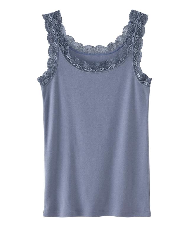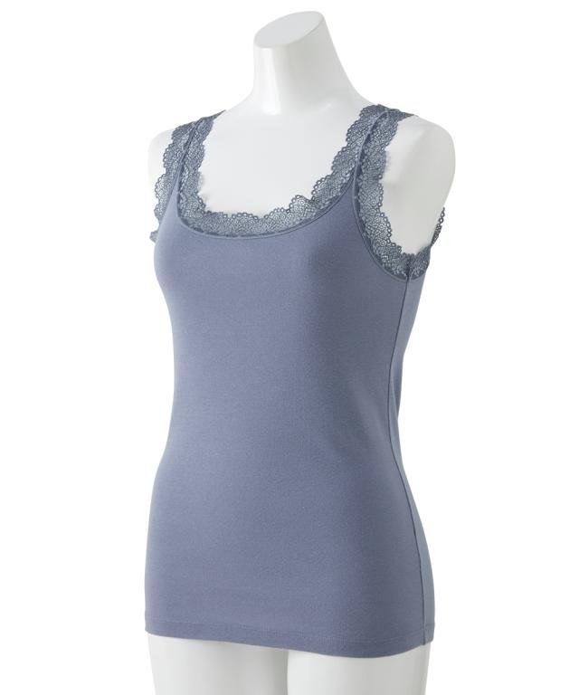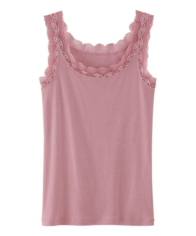 お肌に優しい綿100%フライスインナー 素肌に直接触れるインナーだからこそ、通気性良く肌ざわりのやさしい綿100%をおすすめします。 <天然素材100%> 天然素材コットン100%のインナーは、通気性や吸水性に優れており、さらりと快適な着心地が特徴です。 汗ばむ季節は、吸湿性により汗をすばやく吸収してさらりとした着心地を保ち、冬は保温性により暖かいため、一年を通して、快適に着用できます。 ふんわりとした優しい肌触りで下着の刺激やムレが気になる方にもおすすめです。 <着心地のよい素材> フライス素材ならソフトに横伸びして快適な着心地。 心地よい柔らかさでソフトな風合いが魅力です。 レースが華やかなタンクトップ。 <こんな方におすすめ> ○お肌に優しい素材 ○通年着られる ○豊富なサイズ展開 ※商品の色移りを防止するために個包装を行っている場合がございます。 個包装はプラスチック削減のため一部の色のみに使用しています。