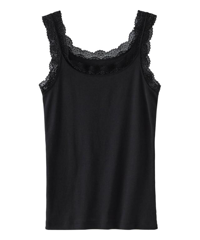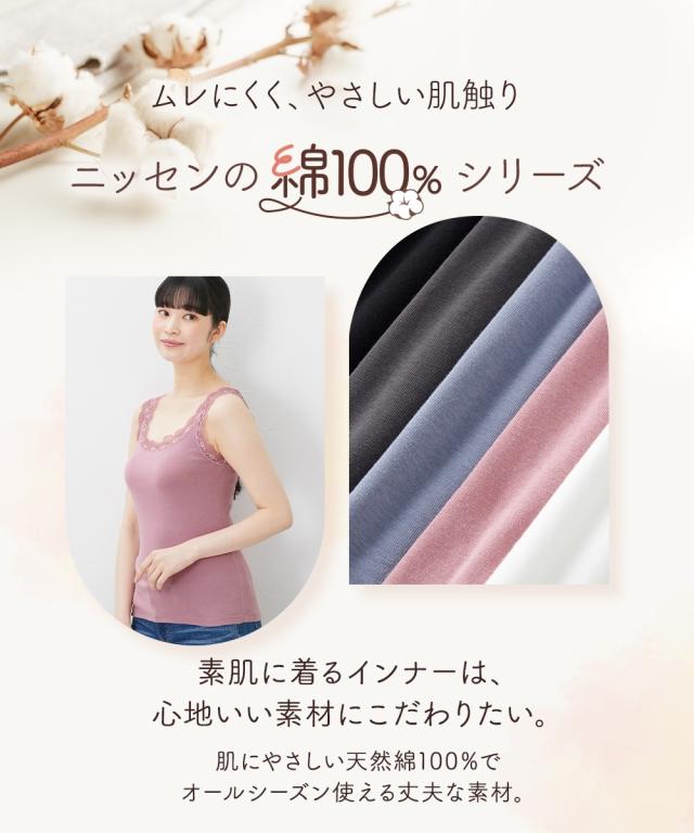 お肌に優しい綿100%フライスインナー 素肌に直接触れるインナーだからこそ、通気性良く肌ざわりのやさしい綿100%をおすすめします。 <天然素材100%> 天然素材コットン100%のインナーは、通気性や吸水性に優れており、さらりと快適な着心地が特徴です。 汗ばむ季節は、吸湿性により汗をすばやく吸収してさらりとした着心地を保ち、冬は保温性により暖かいため、一年を通して、快適に着用できます。 ふんわりとした優しい肌触りで下着の刺激やムレが気になる方にもおすすめです。 <着心地のよい素材> フライス素材ならソフトに横伸びして快適な着心地。 心地よい柔らかさでソフトな風合いが魅力です。 レースが華やかなタンクトップ。 <こんな方におすすめ> ○お肌に優しい素材 ○通年着られる ○豊富なサイズ展開 ※商品の色移りを防止するために個包装を行っている場合がございます。 個包装はプラスチック削減のため一部の色のみに使用しています。