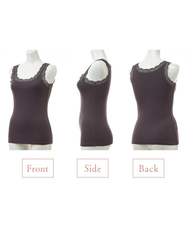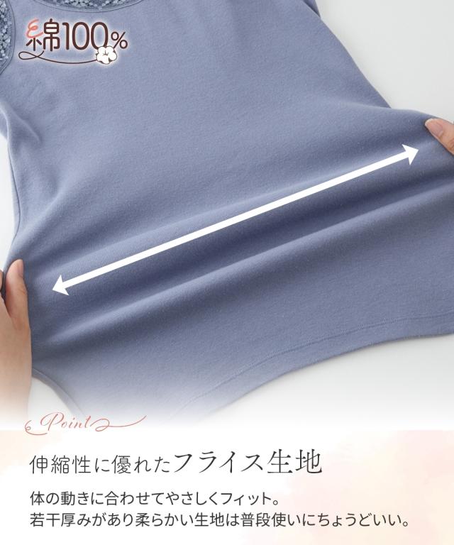 お肌に優しい綿100%フライスインナー 素肌に直接触れるインナーだからこそ、通気性良く肌ざわりのやさしい綿100%をおすすめします。 <天然素材100%> 天然素材コットン100%のインナーは、通気性や吸水性に優れており、さらりと快適な着心地が特徴です。 汗ばむ季節は、吸湿性により汗をすばやく吸収してさらりとした着心地を保ち、冬は保温性により暖かいため、一年を通して、快適に着用できます。 ふんわりとした優しい肌触りで下着の刺激やムレが気になる方にもおすすめです。 <着心地のよい素材> フライス素材ならソフトに横伸びして快適な着心地。 心地よい柔らかさでソフトな風合いが魅力です。 レースが華やかなタンクトップ。 <こんな方におすすめ> ○お肌に優しい素材 ○通年着られる ○豊富なサイズ展開 ※商品の色移りを防止するために個包装を行っている場合がございます。 個包装はプラスチック削減のため一部の色のみに使用しています。