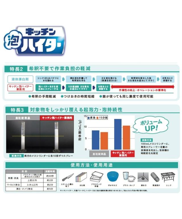 キッチン泡ハイター業務用は、厨房の頑固な油汚れ、ヌメリ、黒カビを強力に分解・漂白・除菌します。
