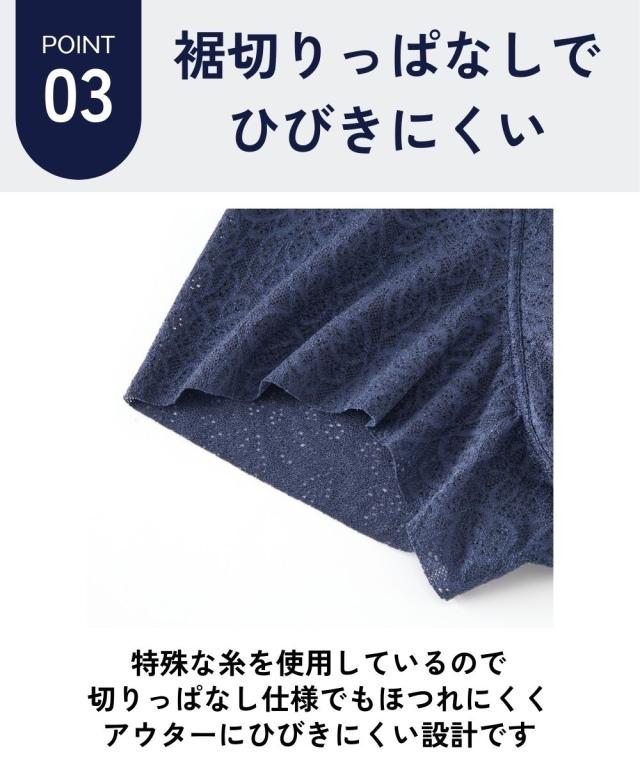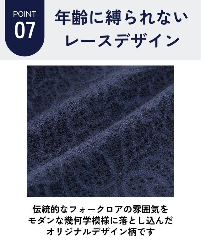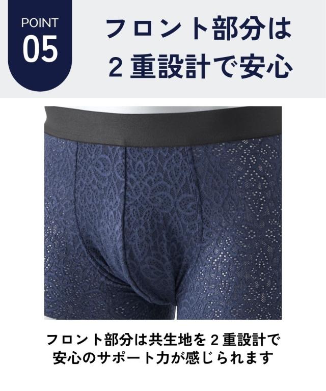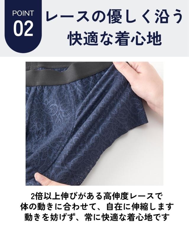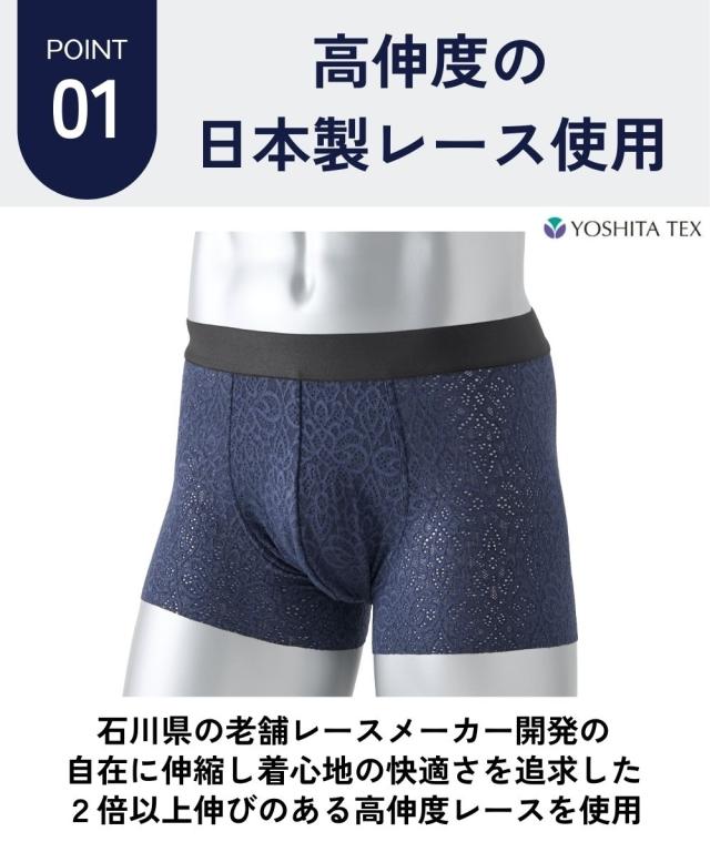 【一度穿いたら手放せない】日本製高機能レースで叶える、快適と安心感。大人のための上質インナー 「まるで何も着けていないみたい」 そう思えるほどの解放感と、頼れるサポート力を両立した、新しいメンズのアンダーウェアが誕生しました。 素材へのこだわり ・希少な国産キュプラ混レース:肌触りなめらかで、吸放湿性に優れた高級天然素材キュプラを肌側全面に使用。ムレを軽減し、一日中さらっと快適な肌心地が続きます。 ・驚異の伸縮性:国産レースメーカー「YOSHITATEX」が開発した、2倍以上の伸びがある高伸度レースを採用。動きにしっかりフィットし、ストレスフリーな穿き心地です。 ・ほつれにくい:融着糸を使用しているため、切りっぱなしでもほつれにくく、アウターに響きにくいスマートな裾を実現しました。 機能性への追求 ・安心のサポート力:フロント部分は共生地二重構造で、しっかりとサポート。 ・快適な肌触り:吸放湿性に優れたキュプラが、気になるムレを軽減。 ・お手入れラクラク:シワになりにくく、扱いやすい素材です。 ・アウターにひびきにくい:裾は切りっぱなし可能で、スマートな着こなしを邪魔しません。 デザインへの想い ・スマートなオリジナル柄:幾度も