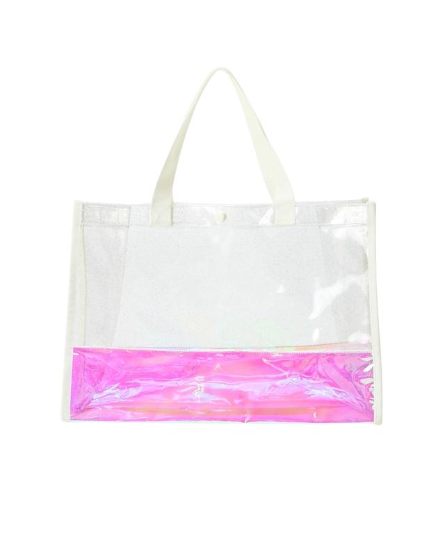 キラキラしてとってもキュートなビーチバッグが登場 インするポーチや袋にこだわればデイリー使いもかわいく使えちゃいます☆ ■デザイン ・下部の切り替えと底面はオーロラカラーでキラキラ☆ ・オーロラ以外の無地部分はラメでかわいい ・バッグの口の部分はスナップ止め ・持ちやすいトートバッグ型 ■素材 ・本体は濡れても安心の塩化ビニル樹脂